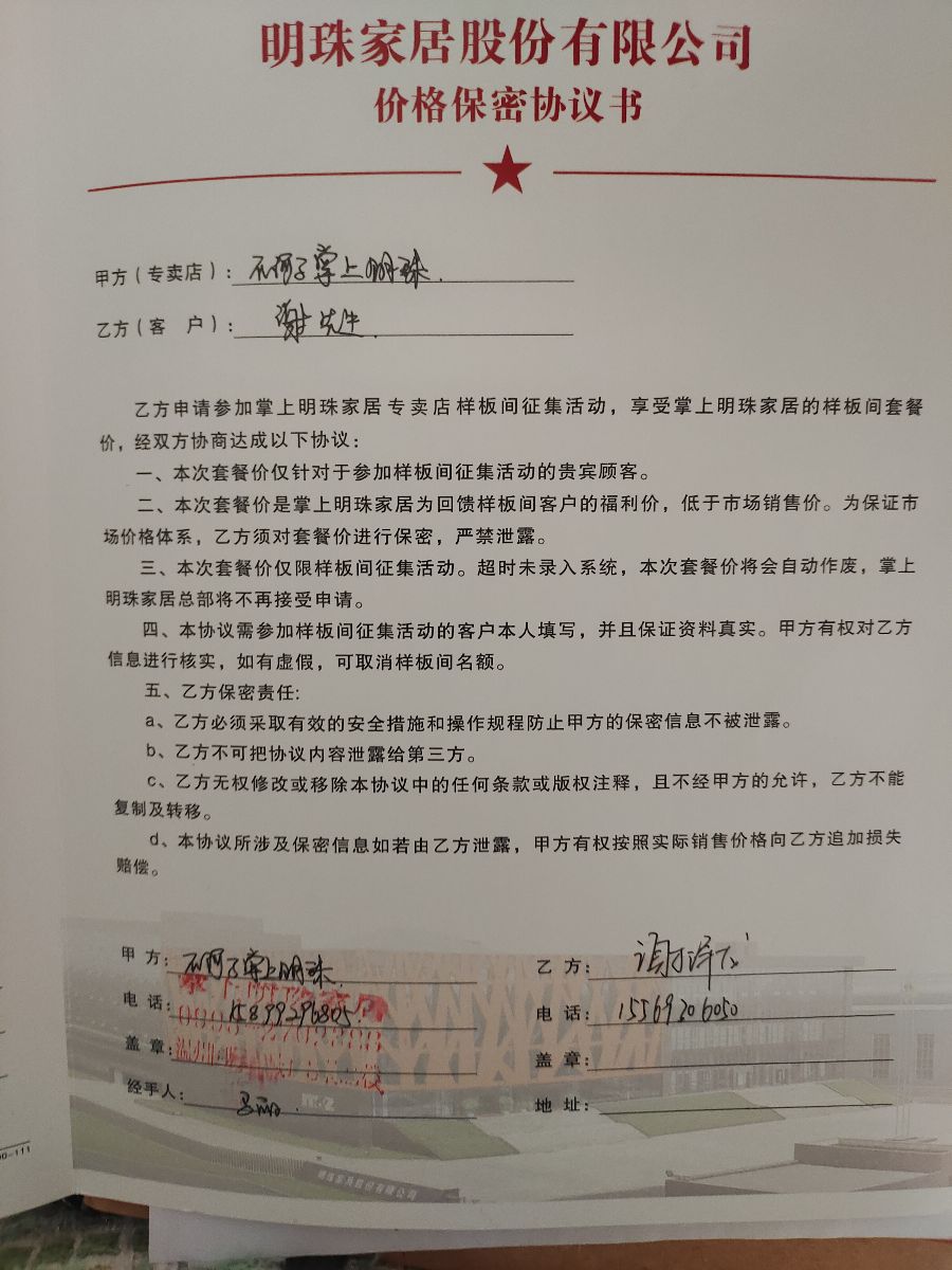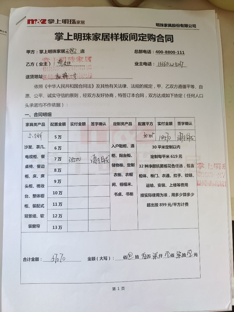 前一天去公司,和我對接的設(shè)計師說可以不走合同,7.5折在門店買家居消費(fèi)一萬元定金即可,第二天設(shè)計師便改口說,定金交給廠家了,無法在門店7.5折消費(fèi)。但是我給掌上明珠家居廠家官方客服打電話,客服明確告訴我,在沒有收到訂單之前,廠家不會收客服定金的。以上與設(shè)計師對話,與廠家通話都有錄音。