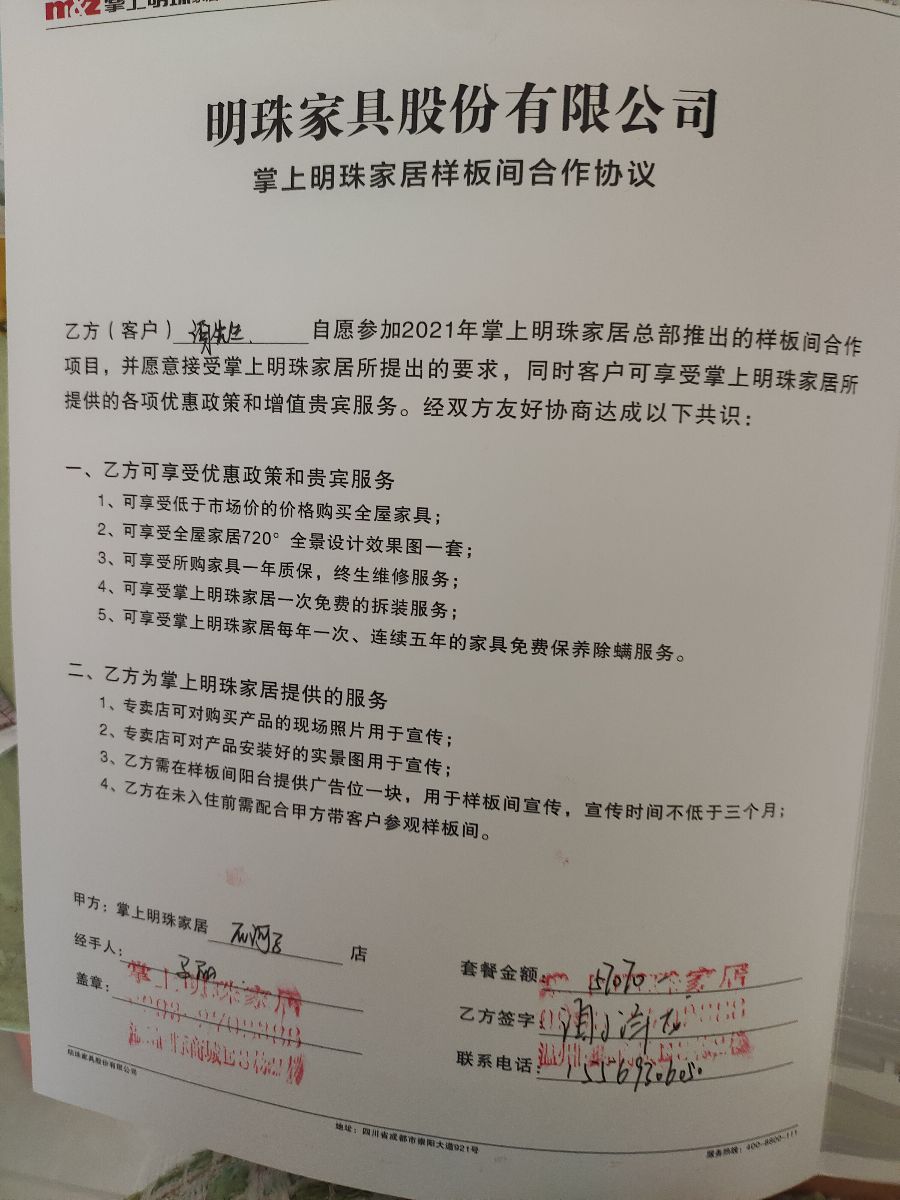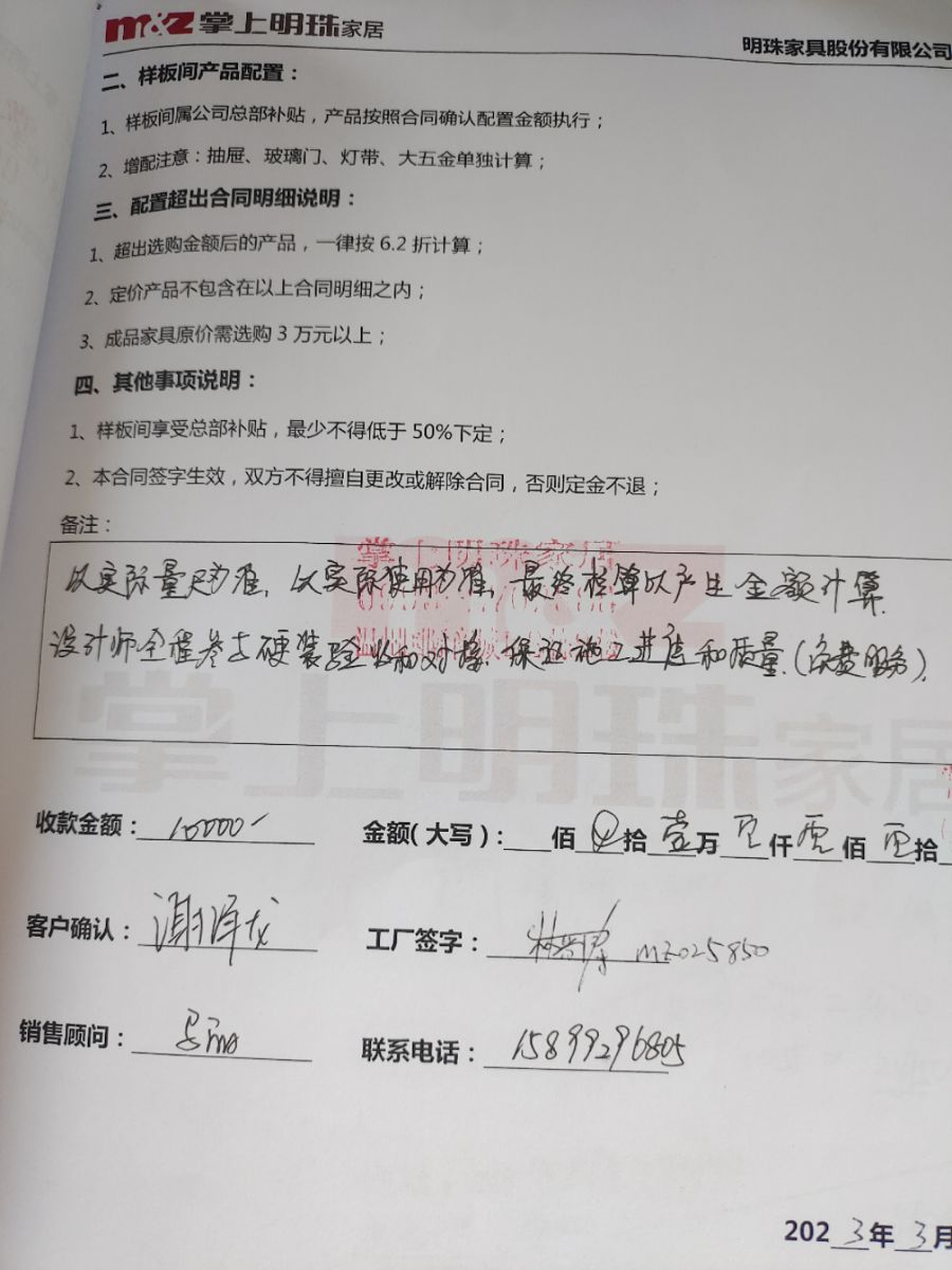 2023年3月5日,掌上明珠家居銷售打電話邀請我去參加公司的樣板間活動,簽了合同并且交了一萬元定金,現(xiàn)公司要求我不僅要做他家的全屋定制類產(chǎn)品,而且必須要消費(fèi)原價7萬元的成品家居,合同才得以生效。