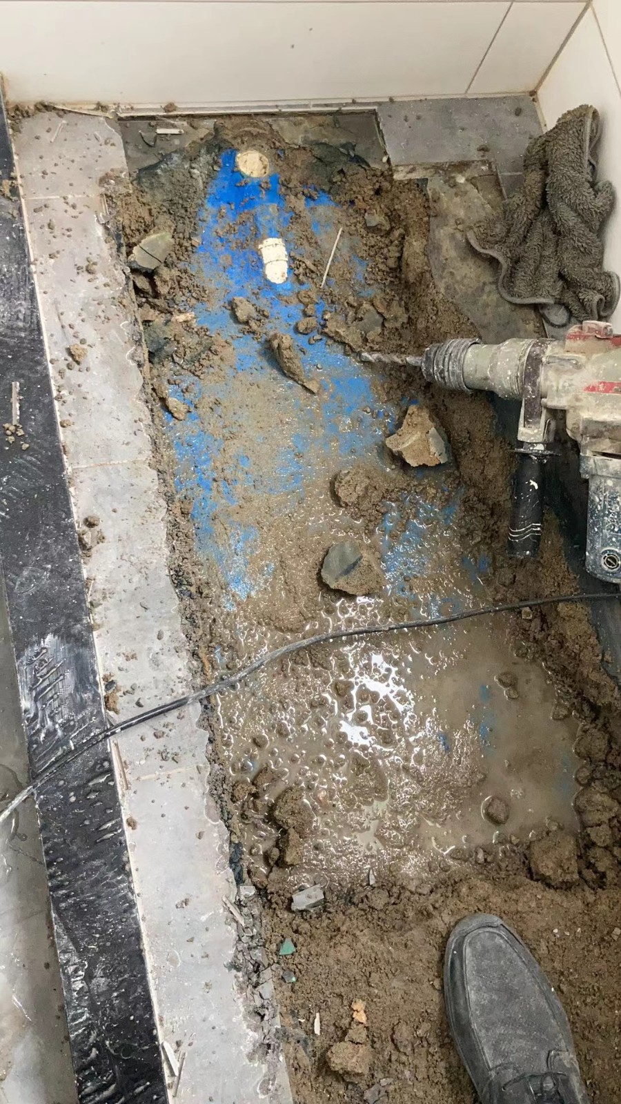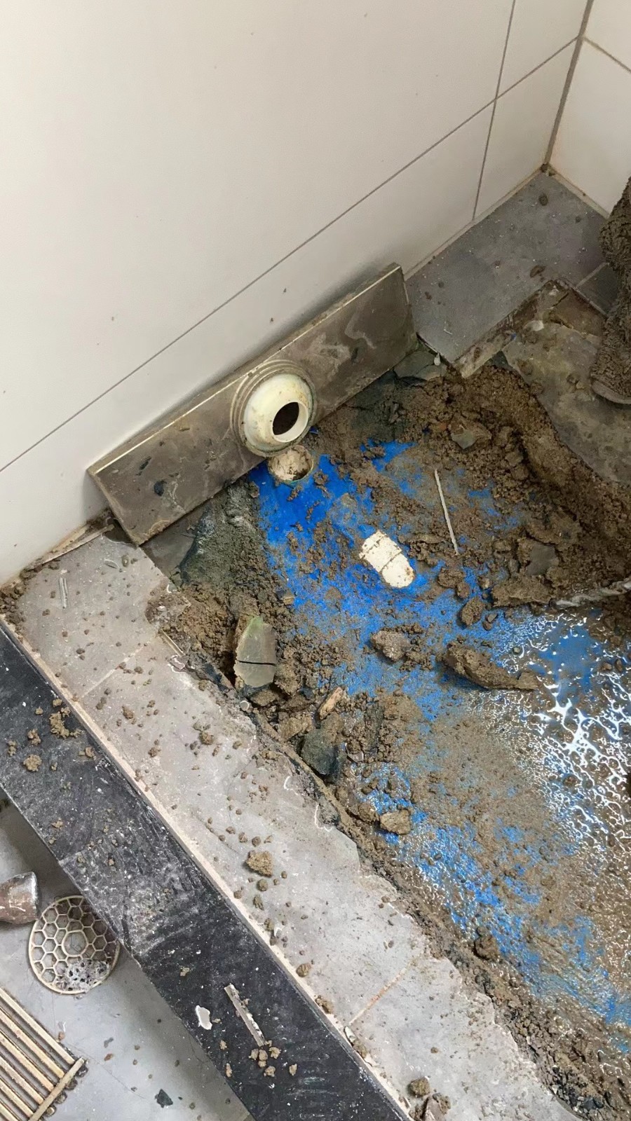 ⑤10月25日,我找人把衛(wèi)生間地面撬開,發(fā)現(xiàn)透水的根本原因是地漏和污水管接口沒有做任何處理就是簡單的搭在一起, 導(dǎo)致砂漿層都是水(根據(jù)《住宅裝飾裝修工程施工規(guī)范》GB50327-2001,這樣的施工是不符合標(biāo)準(zhǔn)的)