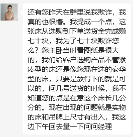 對于上述兩項尺寸問題,我們要求退貨退款,且不認(rèn)可該公司按4.9折退款。至投訴之日已向滬尚茗居反映一周有余,不管設(shè)計師、交付部門還是軟裝部都在互相推諉,毫無進(jìn)展。因而向平臺投訴。