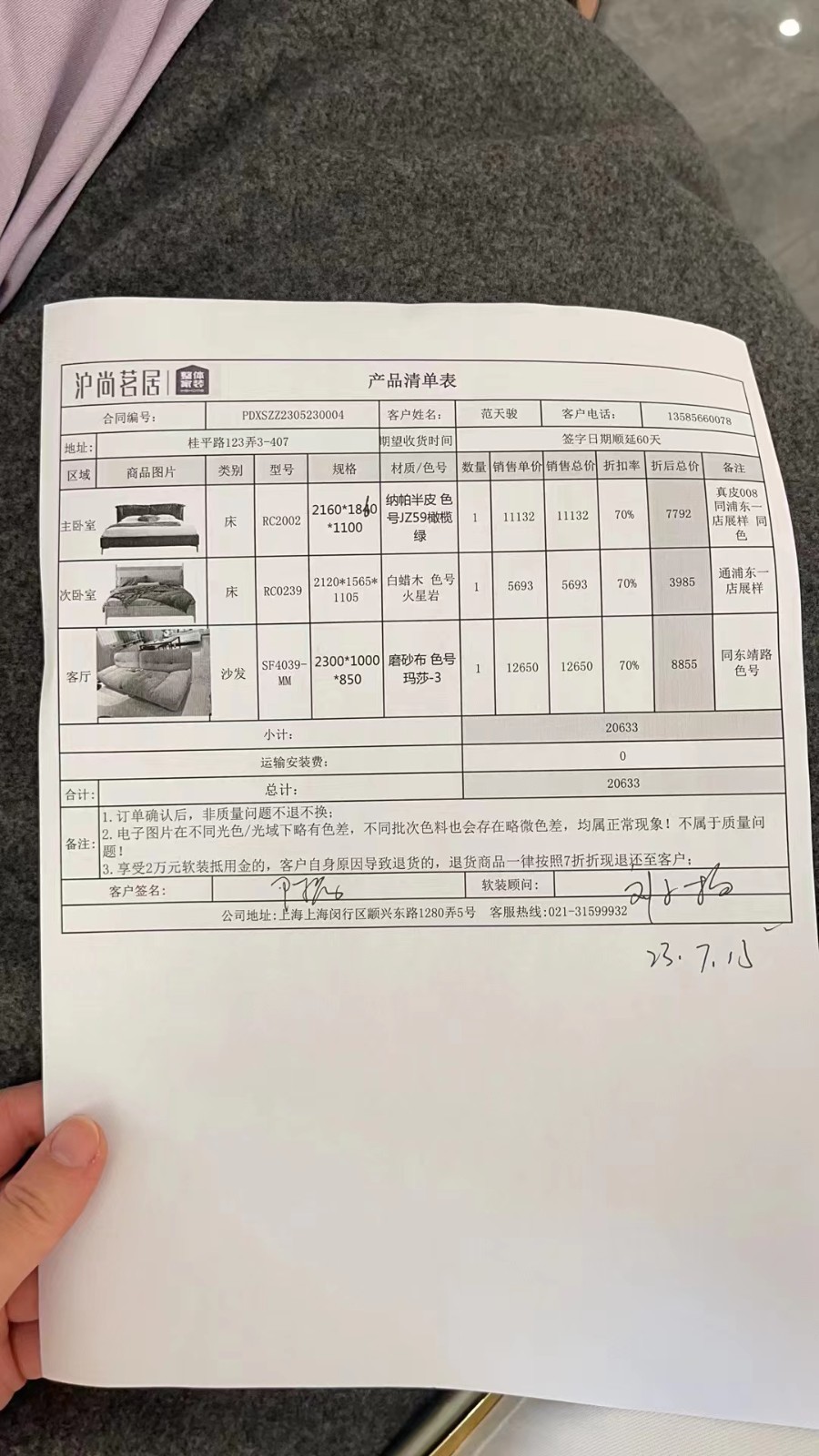 2023年11月硬裝完工后實測老人房寬僅149cm(計入踢腳線后寬),已完全無法容納原定床,對此我們提出退產(chǎn)品,軟裝部稱更換需按7折再7折折價,也就是原銷售價的49折,對此我們無法認(rèn)可和接受。產(chǎn)品是在軟裝部顧問協(xié)助下挑選的,對方先前曾表示已掌握我方戶型設(shè)計,因此尺寸出現(xiàn)問題理應(yīng)由滬尚茗居負(fù)責(zé)。