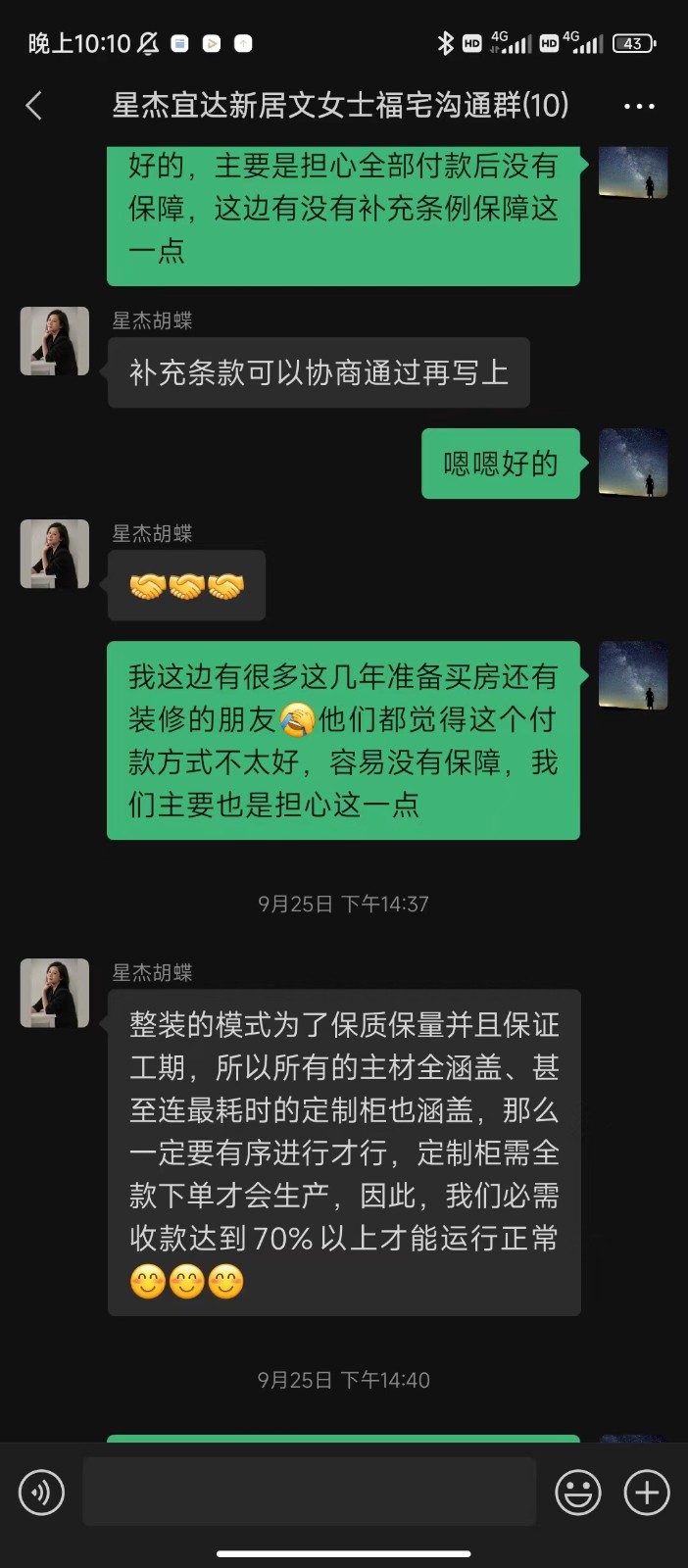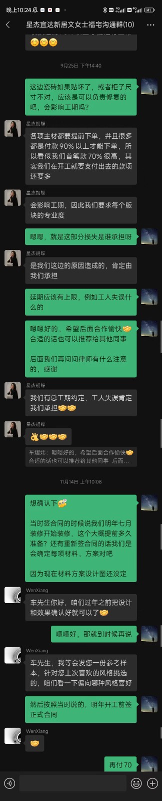 9.25-11.14未主動(dòng)聯(lián)系我們,我們主動(dòng)催促后助理設(shè)計(jì)師回復(fù) 明確交錢后才準(zhǔn)備裝修材料,所以當(dāng)前階段裝修公司無任何損失?。?!
