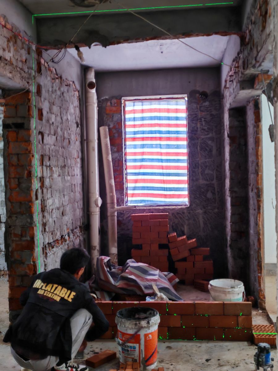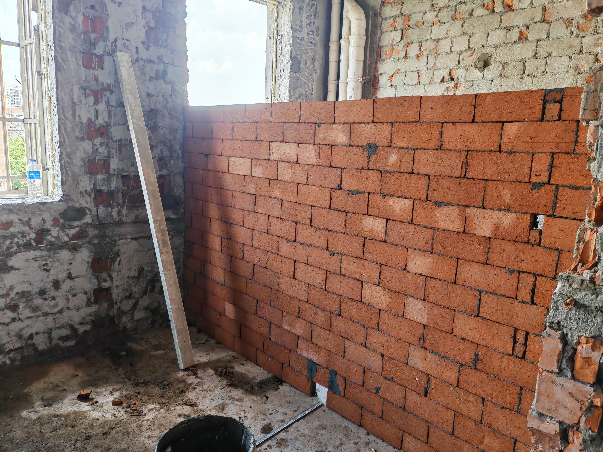 2.新砌兩面紅磚墻體總共5平方,未使用水泥黃沙粘合,而是用的瓷磚粘合劑偷工減料,也未做任何拉筋鋼筋角鋼加固,衛(wèi)生間墻體沒有做防水地梁。