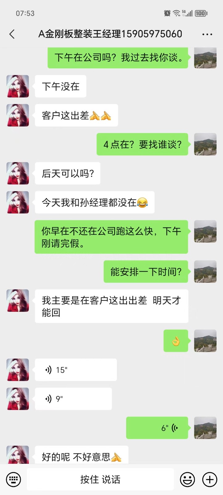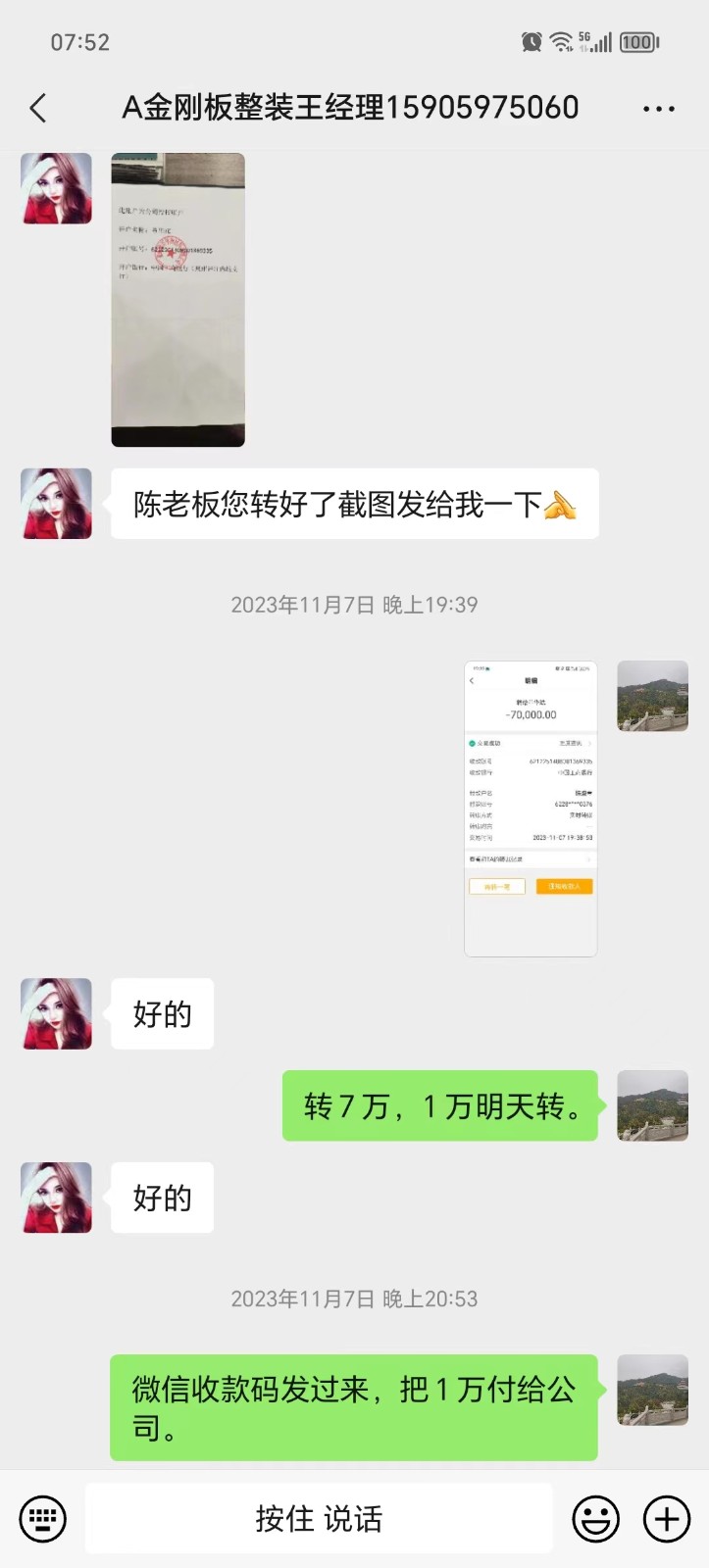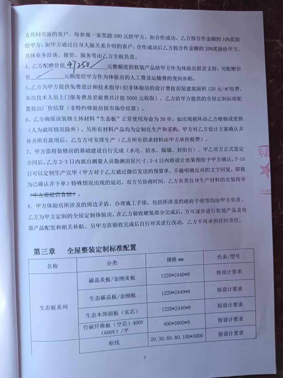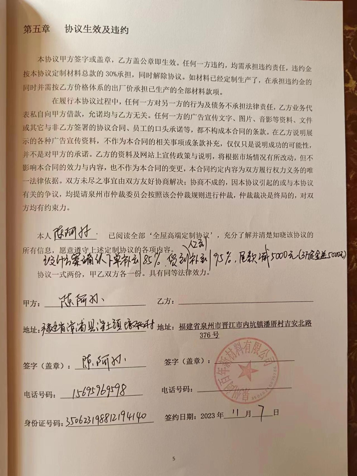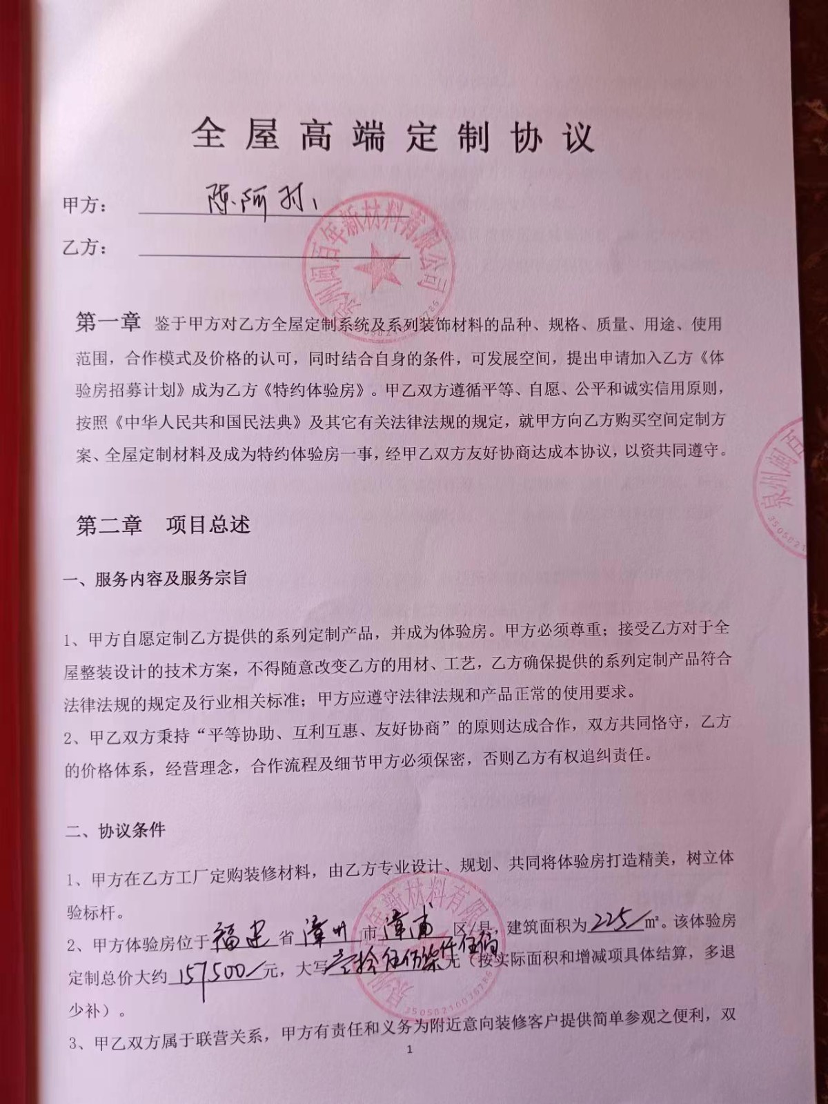 本人于2023年10月2日接到被投訴人營(yíng)銷(xiāo)人員電話號(hào)稱(chēng)王經(jīng)理(手機(jī)號(hào):15905975060)國(guó)慶工廠有做全屋整裝活動(dòng),優(yōu)惠力度很大,送錢(qián)、送家電、送軟裝。3日到工廠進(jìn)行參觀,王經(jīng)理要求先付30000元人民幣送5000元。最后以樣板房的“空頭支票”簽訂全屋整裝協(xié)議。