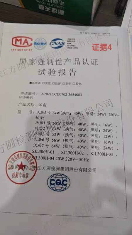 冒用產(chǎn)品認(rèn)證試驗(yàn)報(bào)告,產(chǎn)品名稱(chēng):浴霸;型號(hào):沃居5號(hào);換氣扇、照明《國(guó)家強(qiáng)制性產(chǎn)品認(rèn)證試驗(yàn)報(bào)告》見(jiàn)證據(jù)4(國(guó)家產(chǎn)品認(rèn)證試驗(yàn)報(bào)告)冒用在未經(jīng)認(rèn)證的三無(wú)產(chǎn)品上(處罰款);