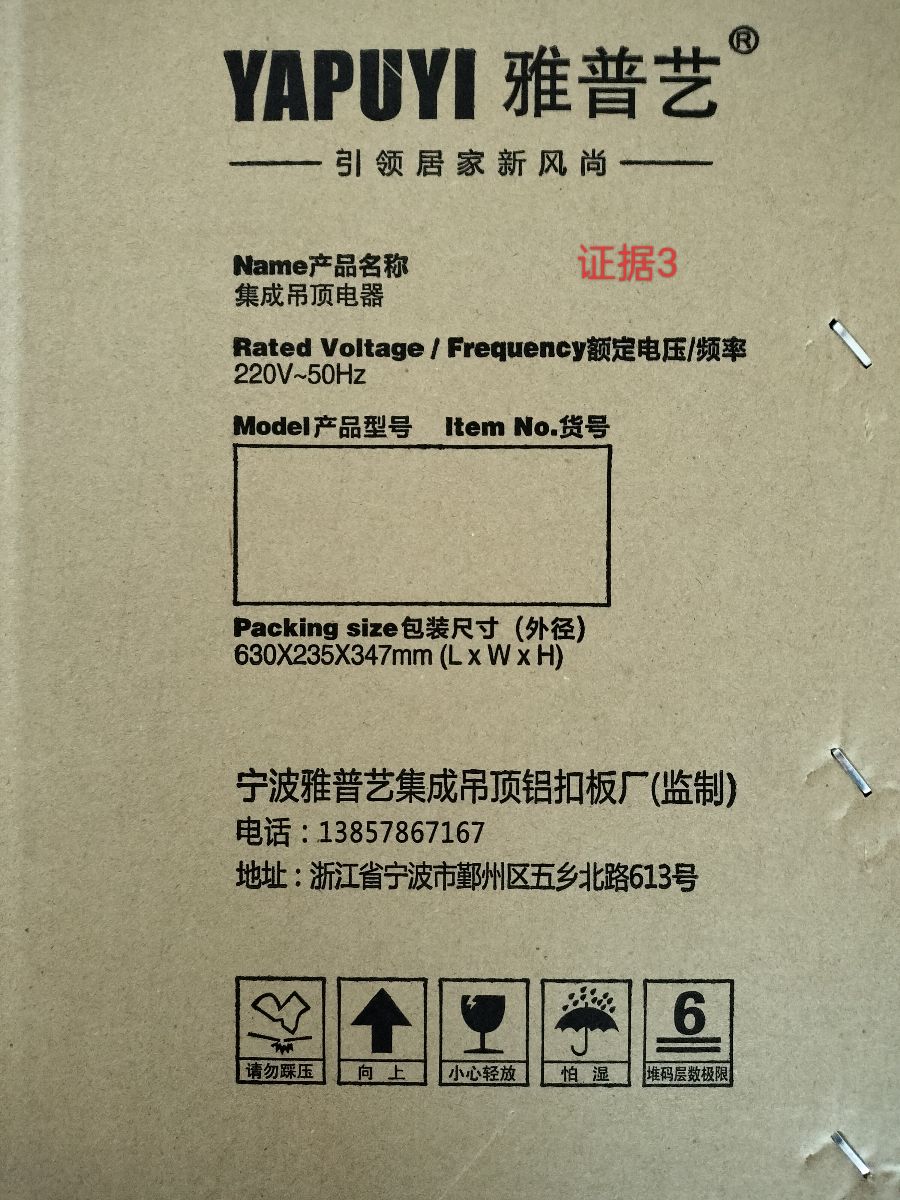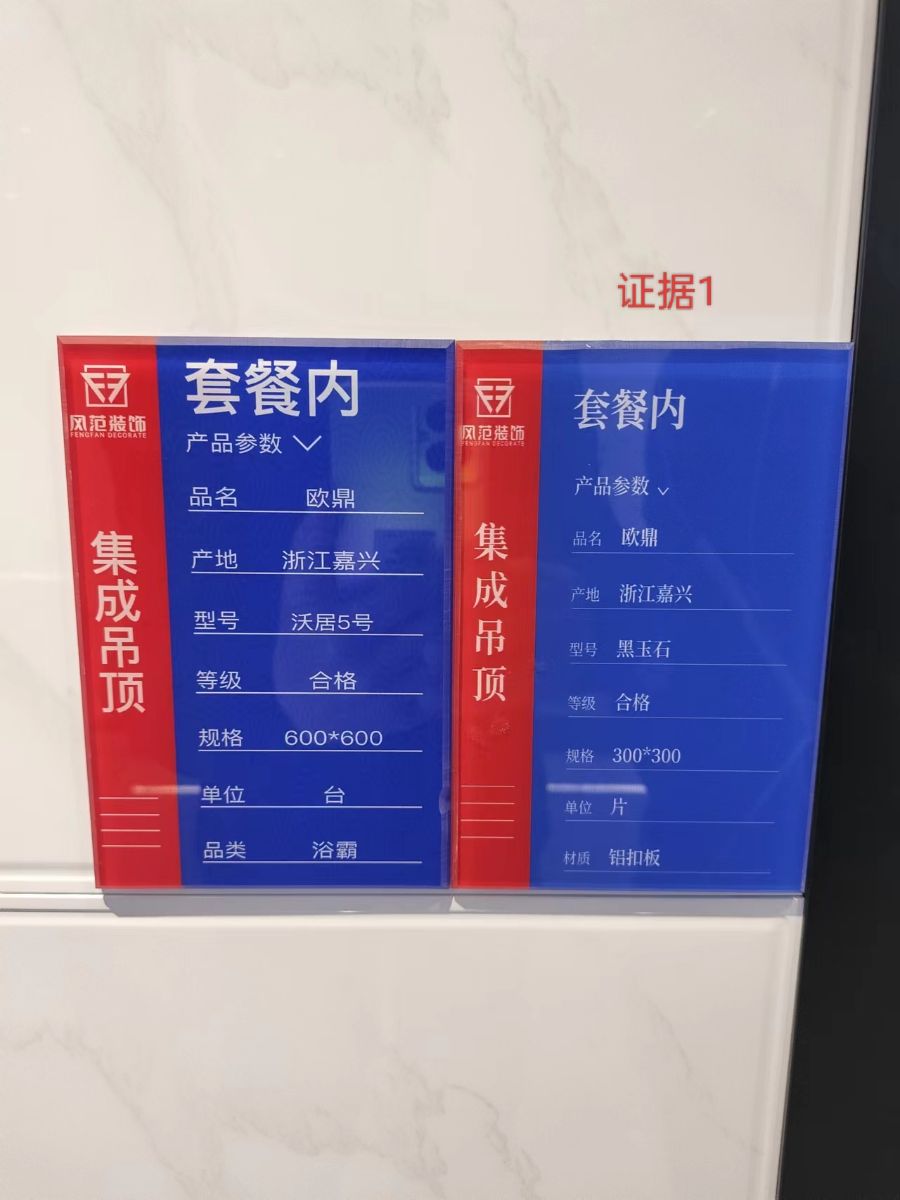 23年4月19日,安裝產(chǎn)品(集成吊頂)公司展示廳產(chǎn)品標(biāo)牌為“歐鼎”,(見(jiàn)證據(jù)1)而包裝箱上顯示(集成吊頂)產(chǎn)品品牌為(雅普藝)工地安裝的產(chǎn)品實(shí)物僅是無(wú)證無(wú)牌無(wú)名稱(chēng)的三無(wú)產(chǎn)品,見(jiàn)(證據(jù)3)