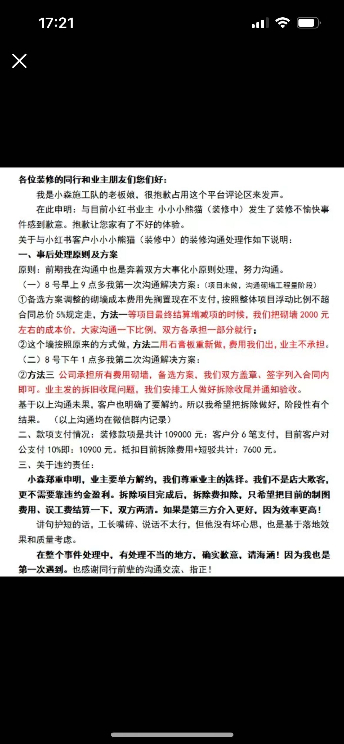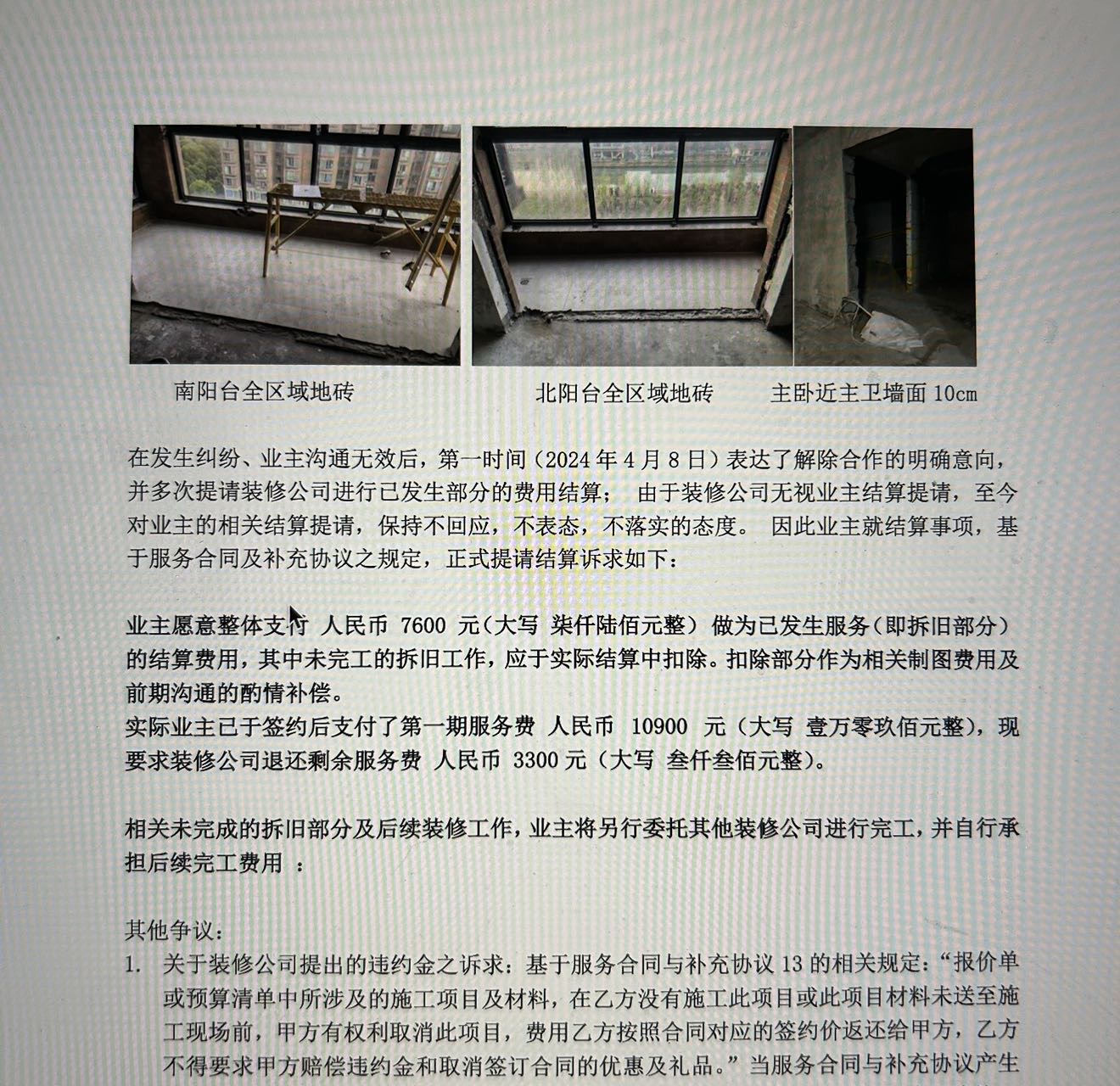 起因是在拆舊過程中,裝修公司告知業(yè)主后期砌墻要增加2000多的費用,產(chǎn)生糾紛,業(yè)主根據(jù)雙方簽字的補充條例第13條,在裝修公司后續(xù)項目還未開始并沒有材料抵達現(xiàn)場基礎(chǔ)上,決定合作就拆舊為止,后續(xù)項目無需他們再進行