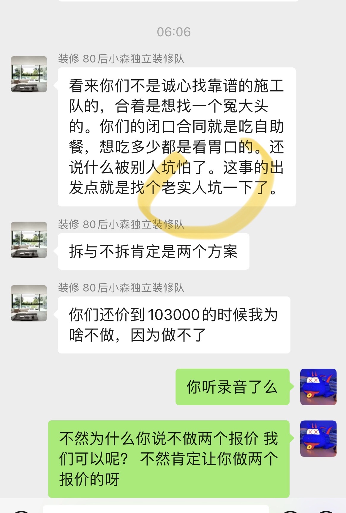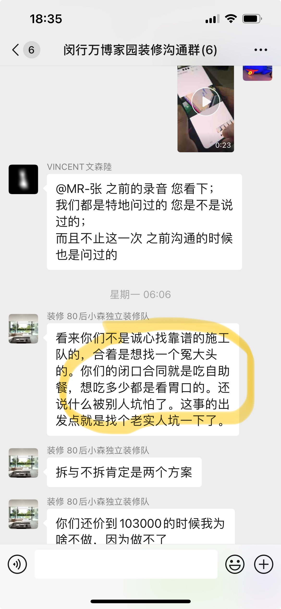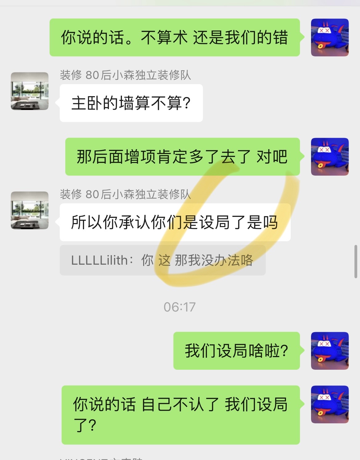 4因裝修隊提出備選方案砌墻需要增加費用,業(yè)主認為不合理而產(chǎn)生口角,彼此相處并不愉快,并認為矛盾已經(jīng)比較激化未來改變可能性不大,以我們彼此信任才能把項目做好的出發(fā)點背道而馳,業(yè)主對未來的合作擔憂,裝修公司的言語包括:“訛人/你們就是找老實人來欺負/去宛平南路/黑心/我就是扶老奶奶過馬路被訛醫(yī)藥費/你們就是來找冤大頭/撒潑打滾等
