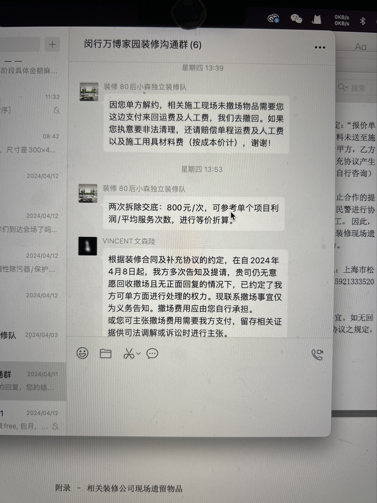 以此為基礎(chǔ),業(yè)主具有結(jié)束與裝修合作合作權(quán)利,我們已經(jīng)通知他們6天,并且前期極力想約他們與第三方協(xié)調(diào),他們拒絕給出配合時間,在糾紛產(chǎn)生第六天,業(yè)主決定根據(jù)此條款,終止合作,并尋找新的合作團隊及時施工,后續(xù)一切工作均與上海御鏞空間設計工程有限公司無關(guān)。