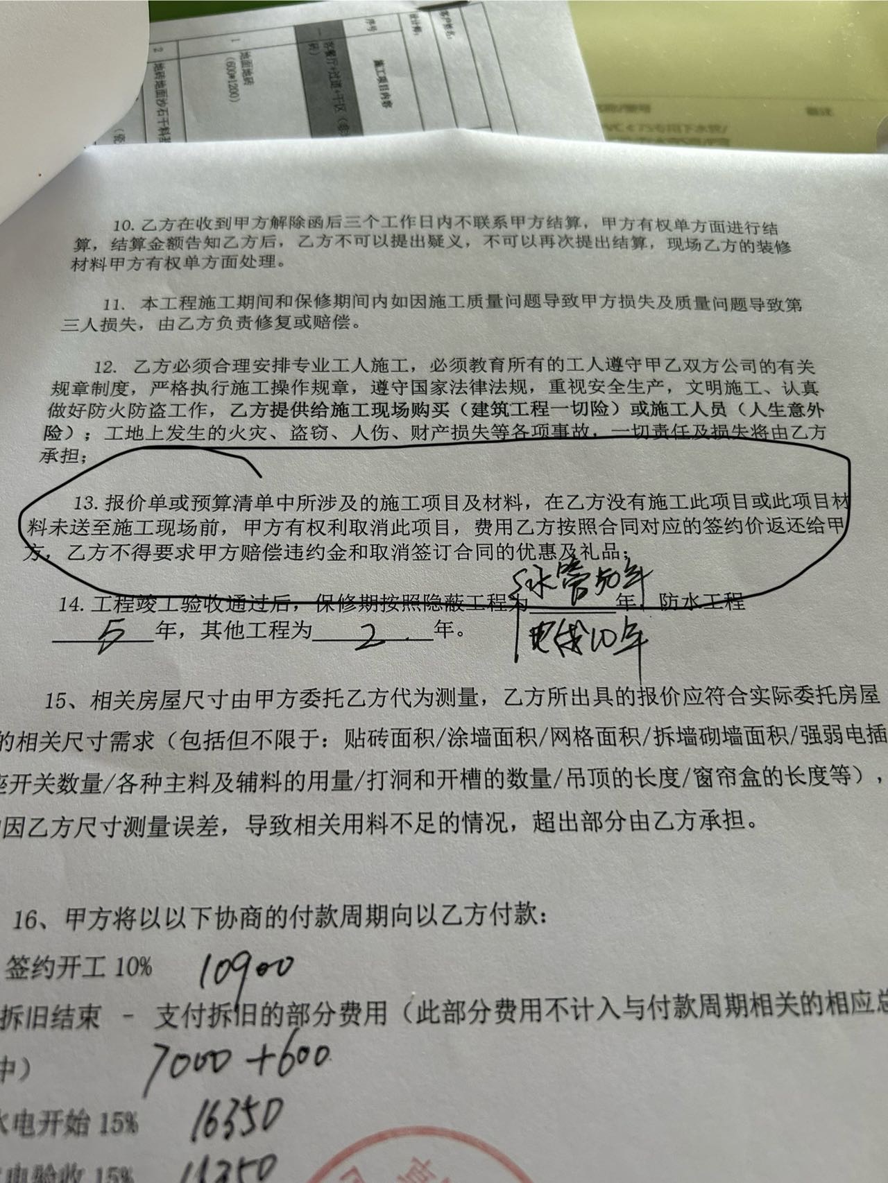 13.報價單或預算清單中所涉及的施工項目及材料,在乙方?jīng)]有施工此項目或此項目材料未送至施工現(xiàn)場前,甲方有權(quán)利取消此項目,費用乙方按照合同對應的簽約價返還給甲方,乙方不得要求甲方賠償違約金和取消簽訂合同的優(yōu)惠及禮品;