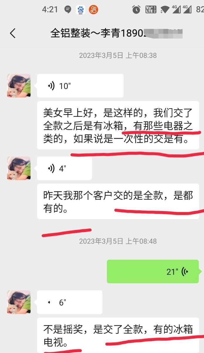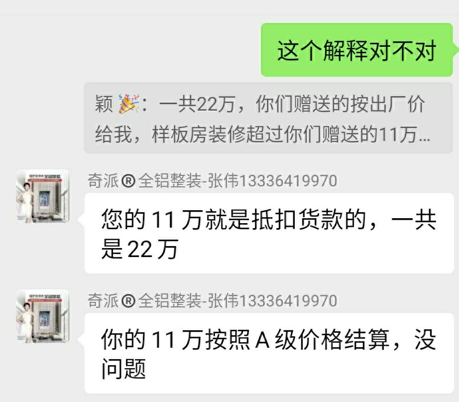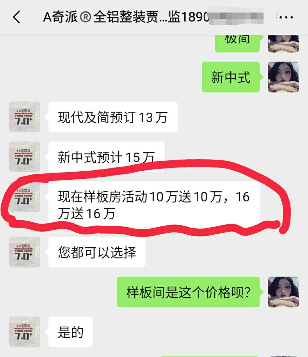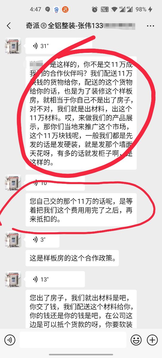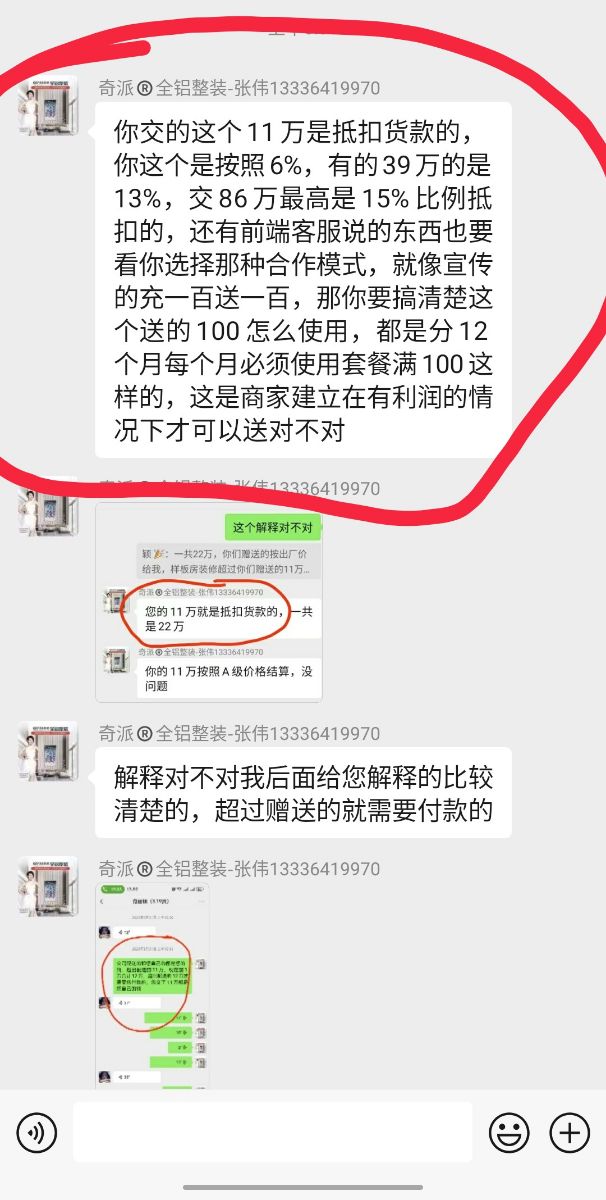 2023年3月19日之前在抖音平臺(tái)看到廣東奇派公司的征集樣板間的宣傳視頻,與之聯(lián)系,貴公司工作人員李某告知來廠參觀考察報(bào)銷往返路費(fèi),還有電器贈(zèng)送等優(yōu)惠,我與家人啟程前往廣東,路途遙遠(yuǎn),費(fèi)用近1萬元,貴公司說報(bào)銷有標(biāo)準(zhǔn),我們的費(fèi)用太高了,至今尚未給報(bào)。3月19日簽約當(dāng)天,貴公司賈總監(jiān)說交多少贈(zèng)送多少(有簽約之前的微信聊天為證,內(nèi)容是交15萬贈(zèng)送15萬的意思),一次性付全款還贈(zèng)送3件大電器(含電視,冰箱和洗衣機(jī),都是云米和小米品牌,有截圖為證,后來經(jīng)與對(duì)接張經(jīng)理協(xié)商答應(yīng)再送一個(gè)同樣的冰箱)今年再問起此事,張經(jīng)理說有兌換券給,沒有再說,簽約當(dāng)時(shí)并沒有給我兌換券,我們也不知道有兌換劵一事,他當(dāng)時(shí)只說裝修完給配送,4件電器將被他們以兌換券之由不予兌現(xiàn)?,F(xiàn)在,裝修到一半,柜子還有客廳,餐廳,衛(wèi)生間,玄關(guān)柜以及門等到?jīng)]到貨,貴公司張經(jīng)理告知需要補(bǔ)款,不補(bǔ)款不能生產(chǎn)。我們簽約時(shí)交了11萬,合同寫贈(zèng)送11萬,加起來是22萬,當(dāng)時(shí)的路費(fèi)未給報(bào)銷,張經(jīng)理說可以以貨物的形式給與補(bǔ)償,我們退一步,默許了,也就是贈(zèng)送是12萬,加上11萬那么一共是23萬,已裝修的費(fèi)用加未生產(chǎn)的柜子合計(jì)后大概是20萬左右,還尚有余額,可是張經(jīng)理卻說讓補(bǔ)款9萬多,說什么贈(zèng)送是以6%的獎(jiǎng)勵(lì)返還。舉個(gè)例子,交10萬返6000。