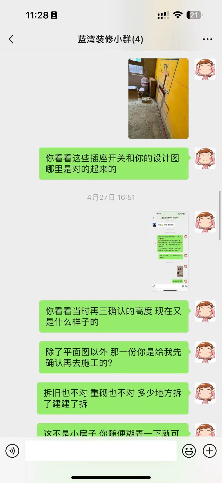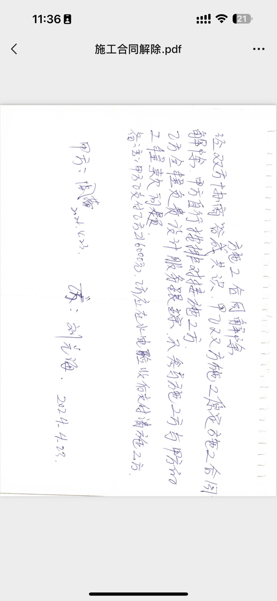 按原施工進(jìn)度因于2024年4月10日完成水電驗(yàn)收。由于乙方未按設(shè)計(jì)合同提供設(shè)計(jì)合同使用說(shuō)明的第五條下第7 強(qiáng)、弱電及多媒體、智能化插座位置分布圖,第8開關(guān)控制線路示意圖,第10 廚、衛(wèi)墻面設(shè)施布置圖,第12樓梯設(shè)計(jì),安裝施工祥圖;第12局部透視圖,乙方缺少土建等相關(guān)資質(zhì)(沒(méi)有建筑施工許可證),導(dǎo)致土建高度有問(wèn)題,水電無(wú)法正常進(jìn)行,至今未完成,所有墻面開關(guān)插座均隨意按裝。雙方于2024年4月23日解除施工合同。