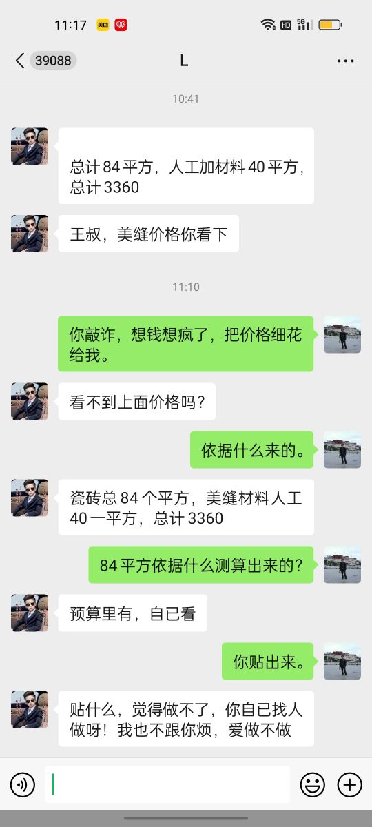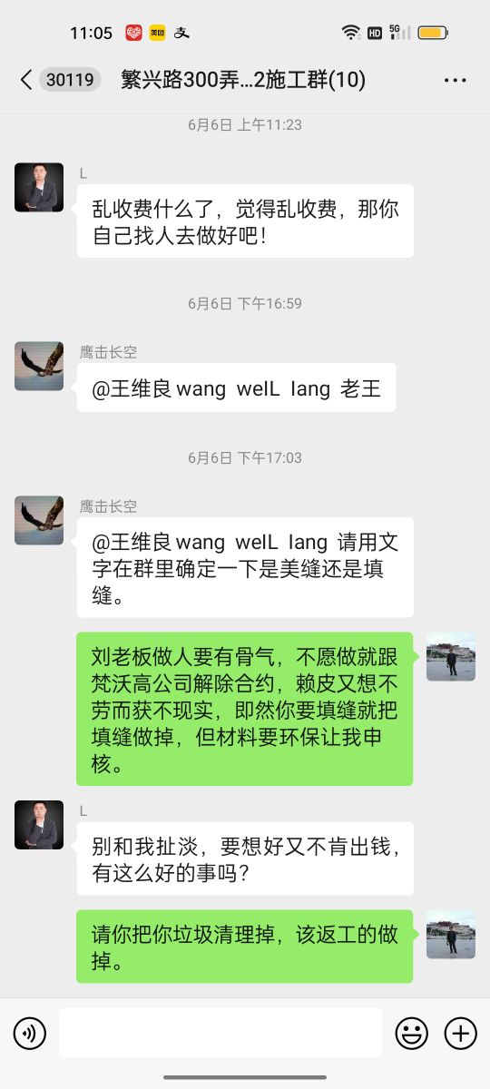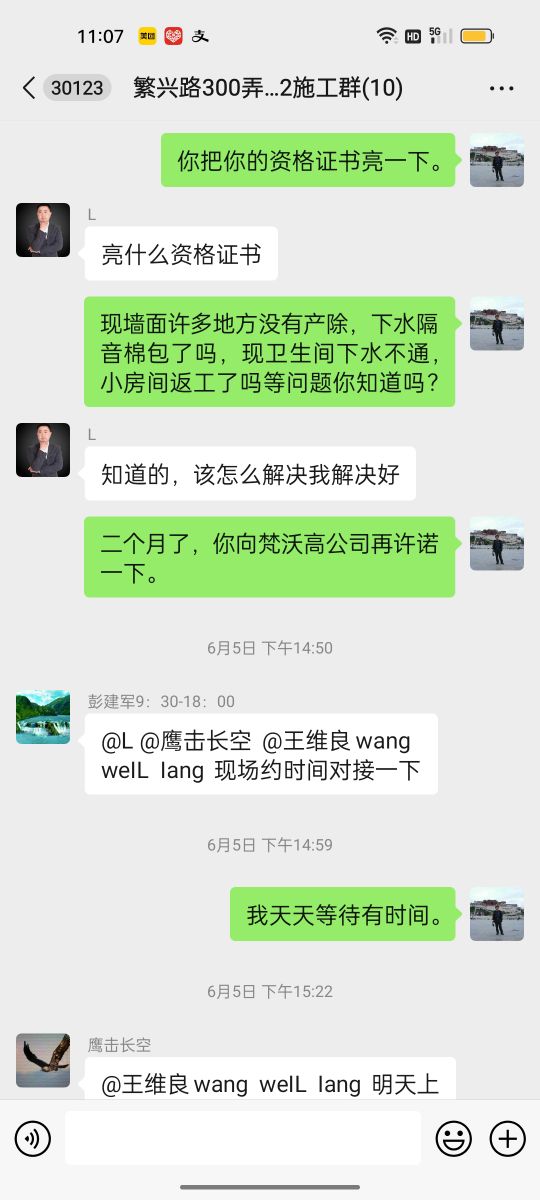 木業(yè)主建筑面積73平方,套內(nèi)60不到,半包金額4萬5,簽約后梵沃高就發(fā)包給劉姓老板工頭,職業(yè)道德極壞,至今沒有像我出示具有培訓(xùn)室內(nèi)裝飾資格證,所有裝修不合法壞點(diǎn)都用上了,使用三無產(chǎn)品,劣質(zhì)材料,隨意增項(xiàng)要錢,更卑鄙的電線盒使用舊的用噴漆噴一下使用在我家里,多次向梵沃高施工群里領(lǐng)導(dǎo)反映工頭劣行希望梵沃高公司約束發(fā)包方尊守職業(yè)道德要規(guī)范施工,無效。