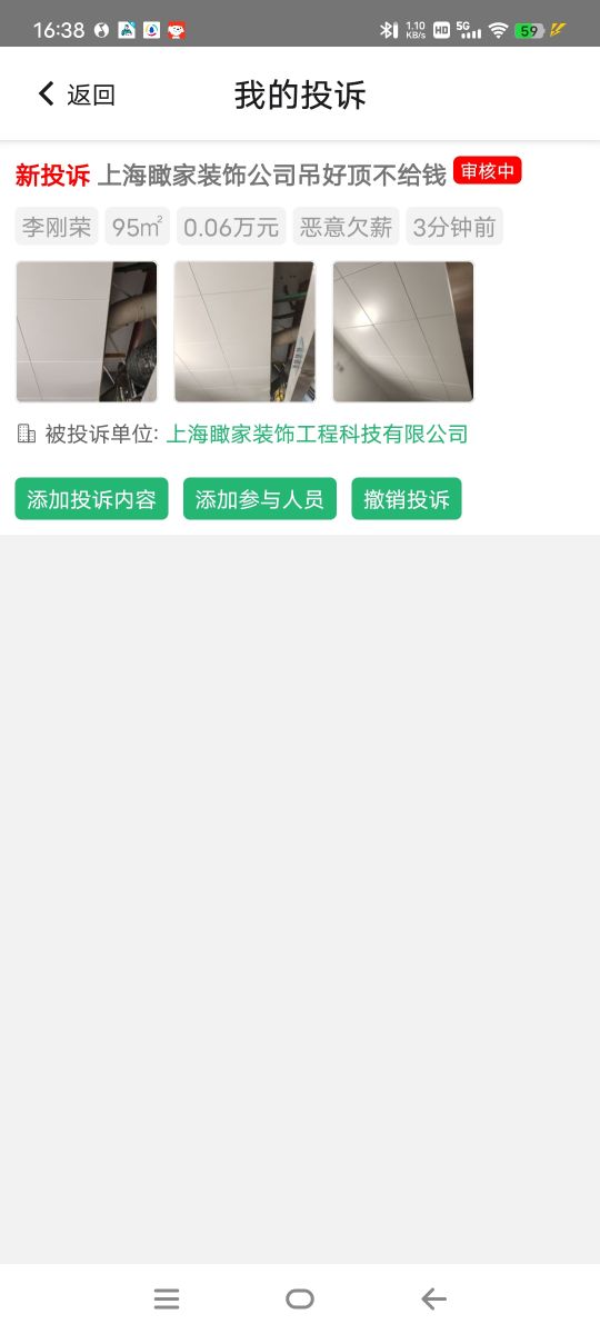 | 投訴類型 | 惡意欠薪 | 投訴人 | 李** | 被投訴單位 | 上海瞰家裝飾工程科技有限公司 |