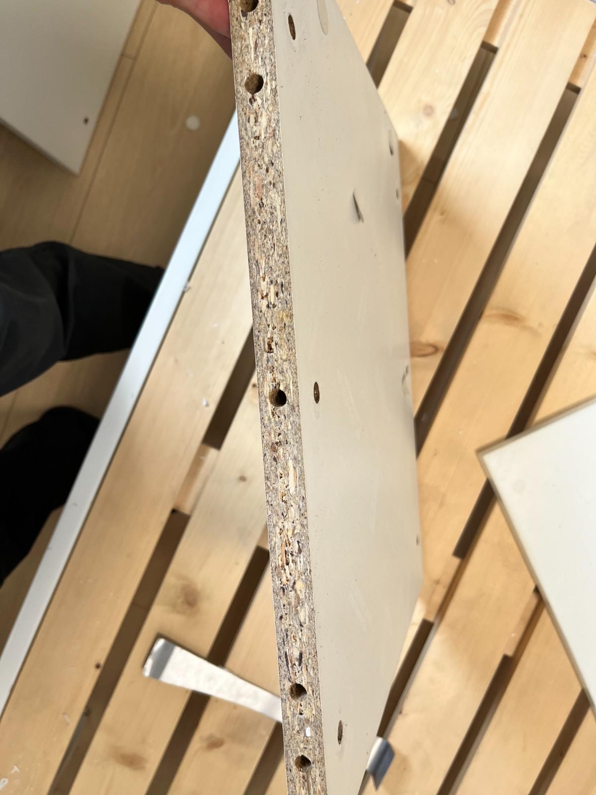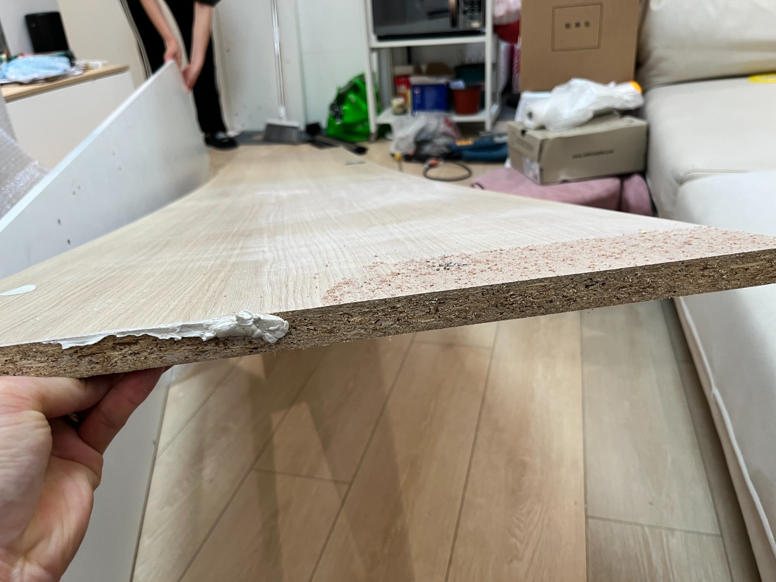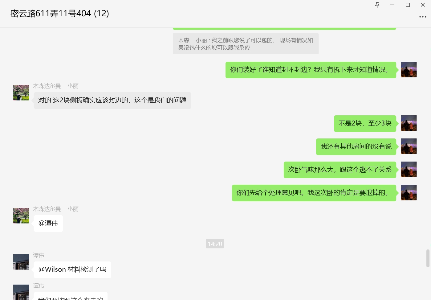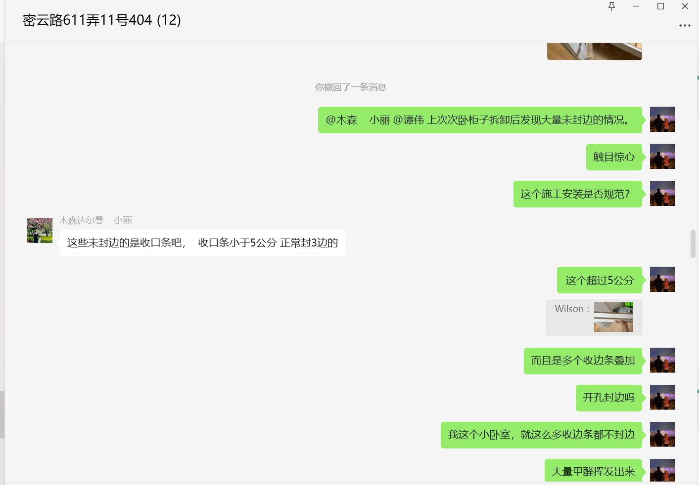廠家一直提說板材環(huán)保合格讓我去找第三方檢測,對于氣味來源說是板材里面的松木等原木氣味,但其他房間并未發(fā)現(xiàn)有這么大氣味。 拆除次臥柜子后發(fā)現(xiàn)有大量木板未封邊(商家解釋說只有小于5公分的封邊條可能不封邊,開孔會錫紙包裹;實際情況是有超過5公分的封邊條未封邊,有多條封邊條疊加進行安裝且均未封邊,有超過3米的板材2塊側(cè)邊未封邊,有衣柜層板側(cè)邊未封邊,有抽屜未封邊,有大量打孔和切割的地方未封邊也未貼錫箔紙等)。后商家又解釋說即便不封邊也是環(huán)保的,對于封邊不封邊說只要板材合格就跟施工工藝無關(guān)。