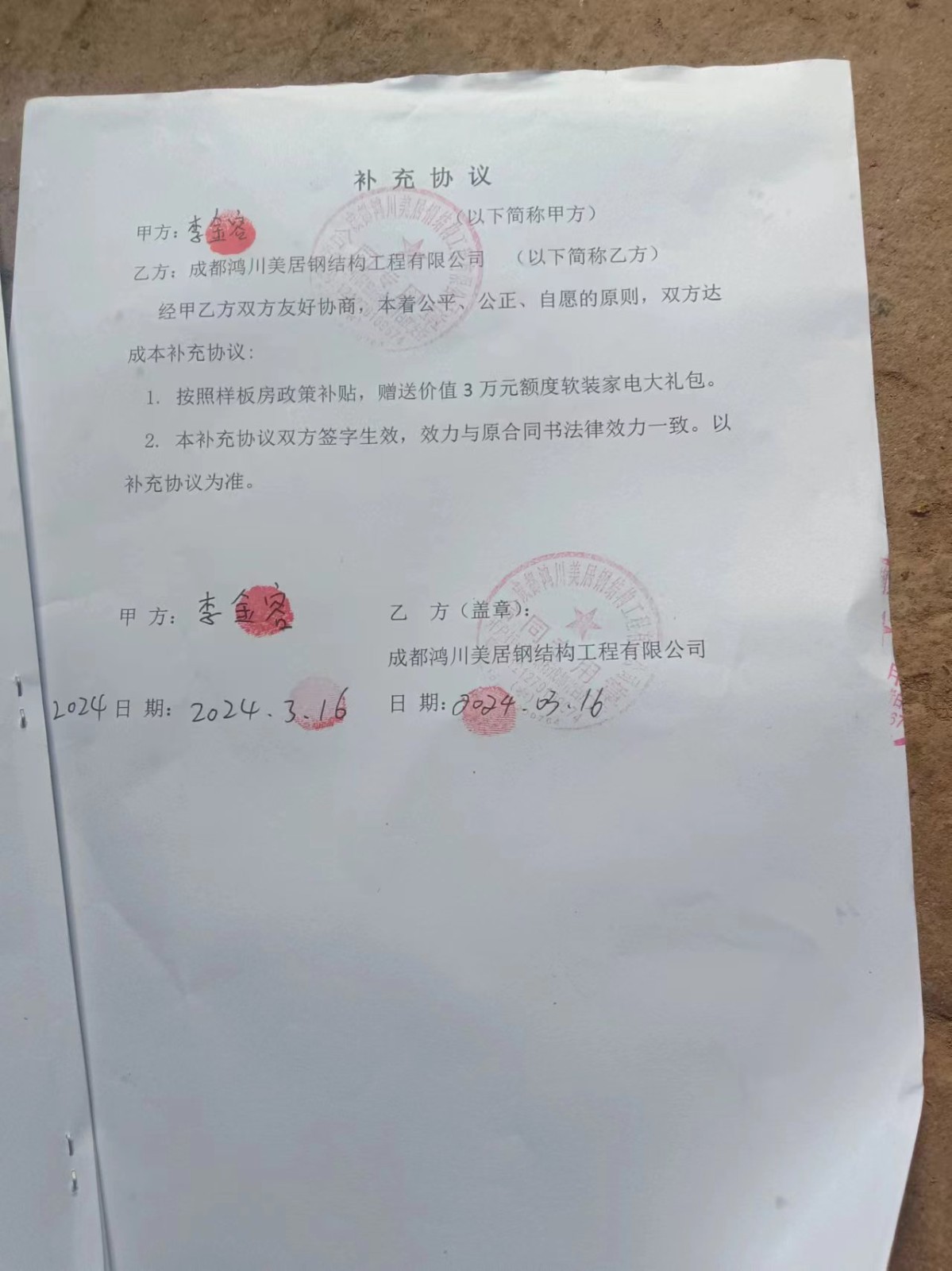 本人李清林,父親(李立明)二個(gè)姐夫及大姐李金容與2024年3月16號(hào)來到成都鴻川美居鋼結(jié)構(gòu)工程有限公司實(shí)地考察,他們業(yè)務(wù)員王經(jīng)理接待參觀樣板間感覺還可以,還說工期40至50天天左右就可以完成。然后幫我計(jì)算房子面積按1400/平米建重輕鋼別墅,除地基施工、主體材料運(yùn)費(fèi)由我們來承擔(dān)外,其他主體以及包括外墻漆內(nèi)裝修吊頂?shù)匕逅娦l(wèi)浴他們公司全包,還預(yù)繳工程款9萬送3萬電器,質(zhì)量達(dá)到樣板房標(biāo)準(zhǔn),說得很誠懇。合同他說都是統(tǒng)一的,然后就沒有仔細(xì)看,以為這么大公司還是講誠信的。同時(shí)我們說了我們大概的想法,建造面積120平米左右,后來設(shè)計(jì)圖出來。說有170多平米,滿滿的套路,后多次協(xié)商按照169平米計(jì)算。