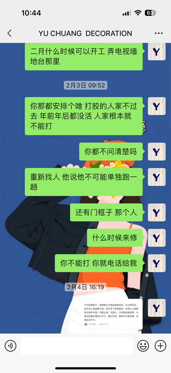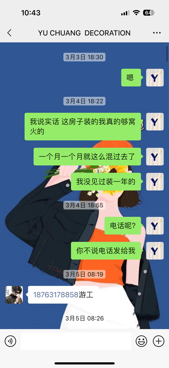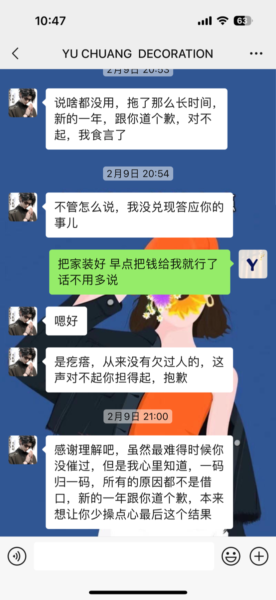 您好 我家住威海文登恒大翡翠華庭26-1001 ???去年六月份與青島宇創(chuàng)建筑裝飾工程有限公司簽訂裝修合同 原定八月份完工 至今拖延一年