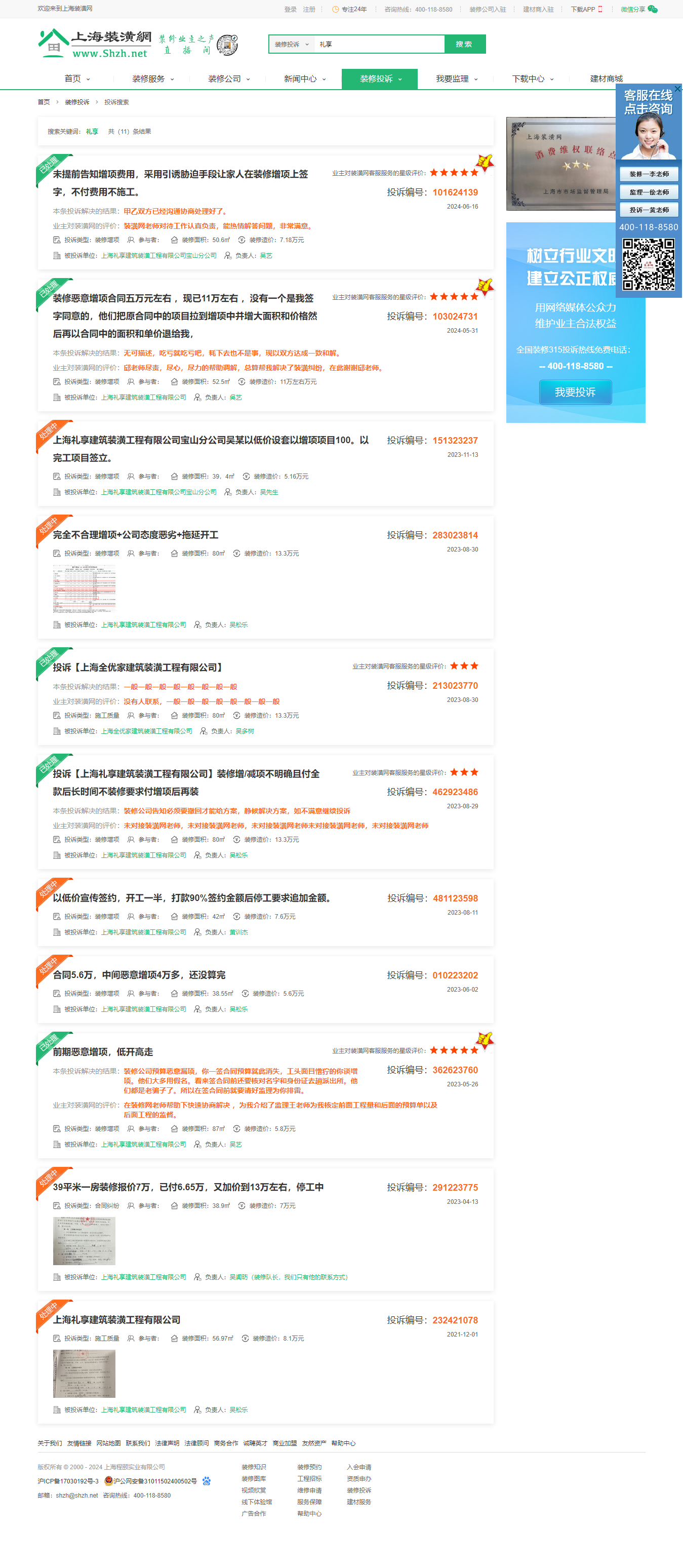 | 投訴類型 | 裝修增項 | 投訴人 | 忻** | 被投訴單位 | 上海禮享建筑裝潢工程有限公司 |
