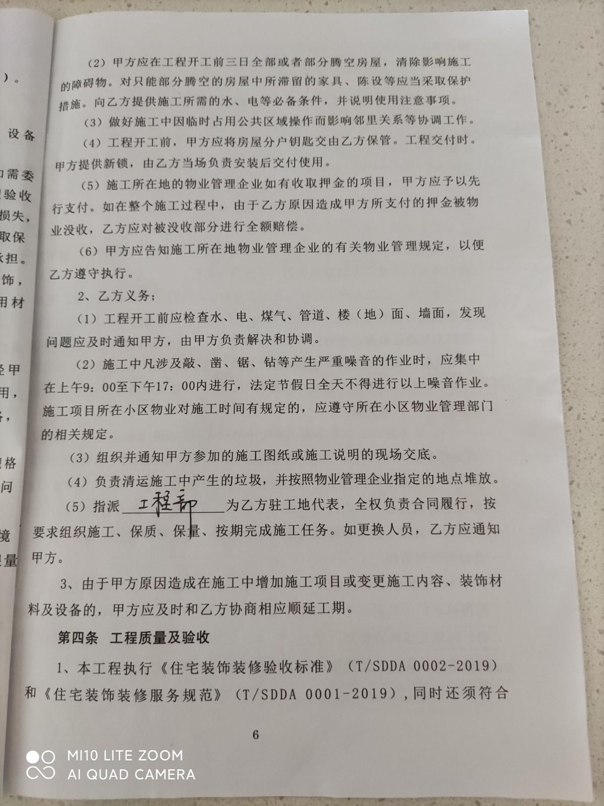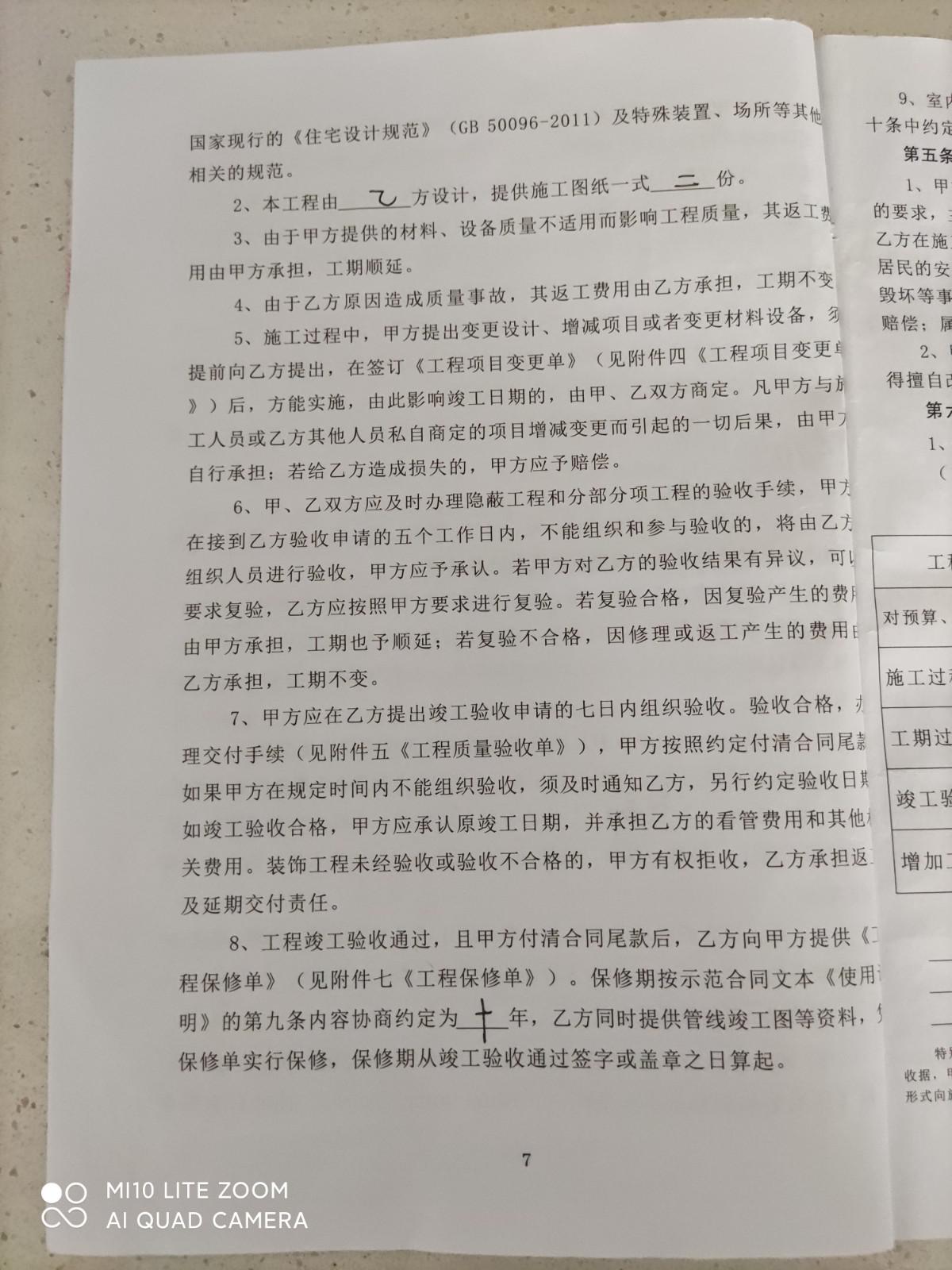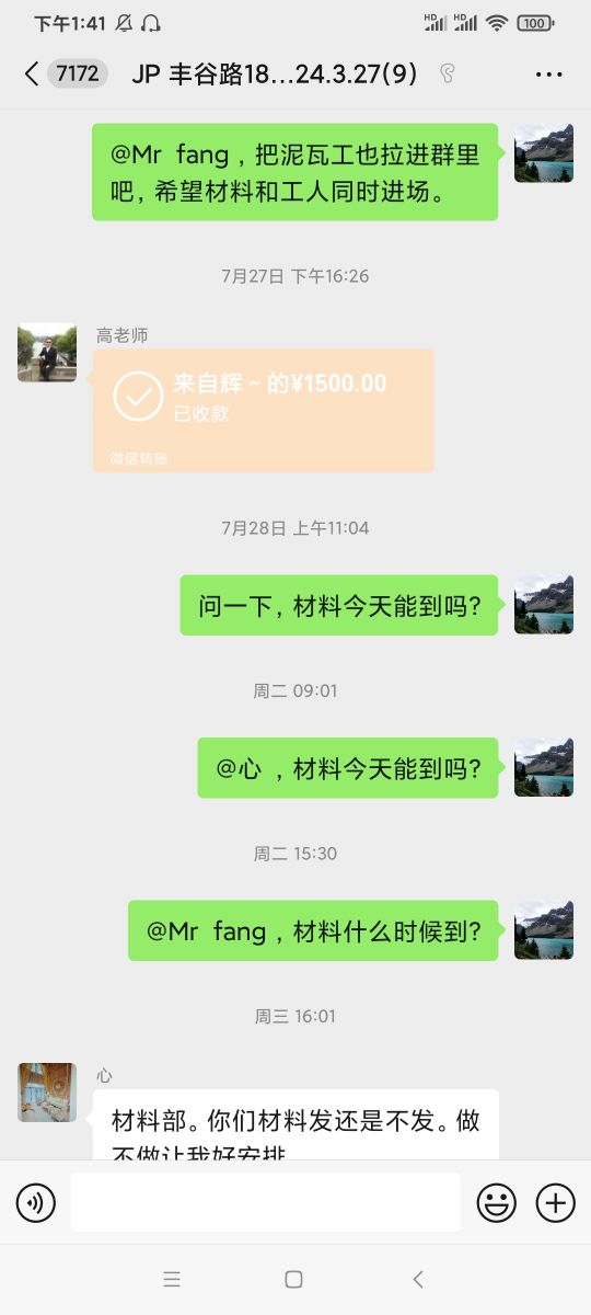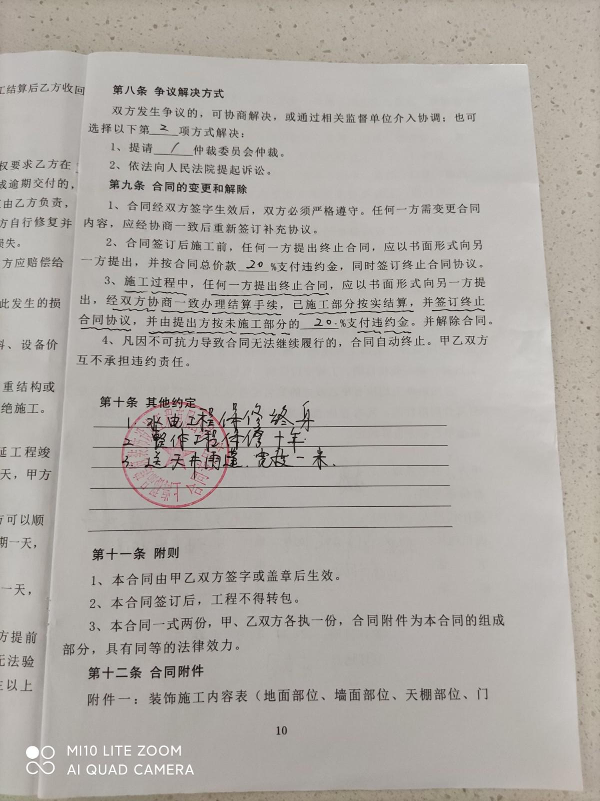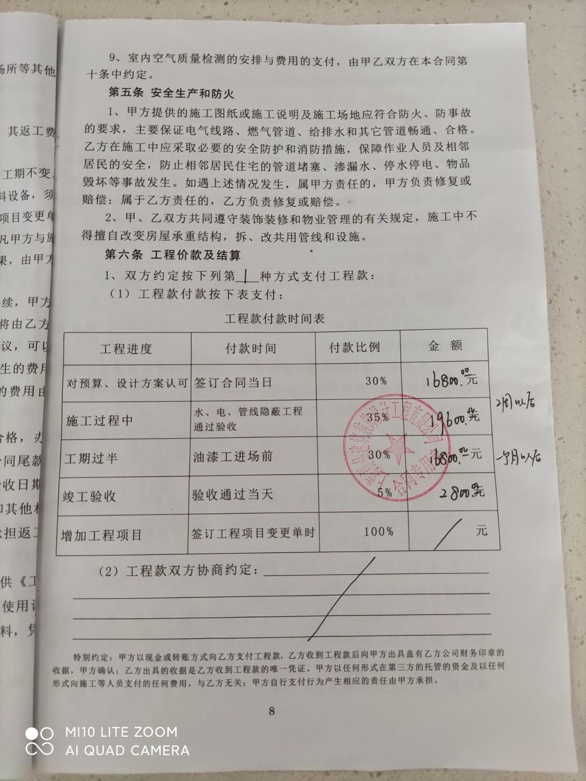 開(kāi)具工程質(zhì)量驗(yàn)收單之后,當(dāng)場(chǎng)支付給公司二期工程款,總價(jià)35%(19600元),施工隊(duì)長(zhǎng)告知水電增加款6791元,5月29日與公司高衛(wèi)兵老師和施工隊(duì)長(zhǎng)韓春祝在施工地溝通確認(rèn)后支付給隊(duì)長(zhǎng)增加款6000元。5月31日公司通知瓷磚,地磚到貨,當(dāng)時(shí)高衛(wèi)兵說(shuō)大地磚是澳斯冠,墻磚和地磚是阿波羅的,現(xiàn)場(chǎng)看到天井地磚只顯示豪華地磚沒(méi)有品牌。6月3日公司叫我們自己買(mǎi)防盜門(mén),說(shuō)漲價(jià)了公司買(mǎi)不進(jìn)來(lái)了(防盜門(mén)造價(jià)單上報(bào)價(jià)1680元)。6月1日開(kāi)始就沒(méi)有工人施工,韓春祝告知公司關(guān)門(mén)停業(yè),工人不做了,經(jīng)多次催促,于6月18日,法人方錫寶重新派工人來(lái)干活,并和高衛(wèi)兵到施工地看后,提出增加款:找平,廚衛(wèi)粉刷,瓷磚粘貼劑等共計(jì)壹萬(wàn)元(其實(shí)是二期工程款支付后進(jìn)的材料),不付款就停工(惡意增收),6月23日停工,7月2日方錫寶和高衛(wèi)兵再次到施工地核實(shí)確認(rèn),增加款為3287.5元(有照片),我們要求公司按照合同的約定(造價(jià)單明細(xì))完成泥瓦工的工作,即:廚房,衛(wèi)生間,墻磚地磚,天井的地磚,客廳的找平,增加部分做好后再支付,這樣也能保證質(zhì)量,但方錫寶不肯,他說(shuō)不付款就停工,多次溝通后,于7月11日,高衛(wèi)兵通知說(shuō)老板不做了,清算結(jié)賬。約在7月24日清算又爽約沒(méi)來(lái),又約在7月26日工程部宋偉新(經(jīng)理)和高衛(wèi)兵來(lái)到施工地清算,宋偉新看后說(shuō)瓦工部分沒(méi)做好,提議把瓦工活干完,經(jīng)高衛(wèi)兵和方錫寶電話溝通同意這一方案,增加款(有照片)先付壹仠伍佰元給高衛(wèi)兵,后期余款在泥工完成后付。本人于7月27日徽信群里支付給高衛(wèi)兵后,材料一直沒(méi)有送到施工地。本人訴求:1)履行合同,2)停止施工就按實(shí)結(jié)算,中止合同并解除合同支付違約金。