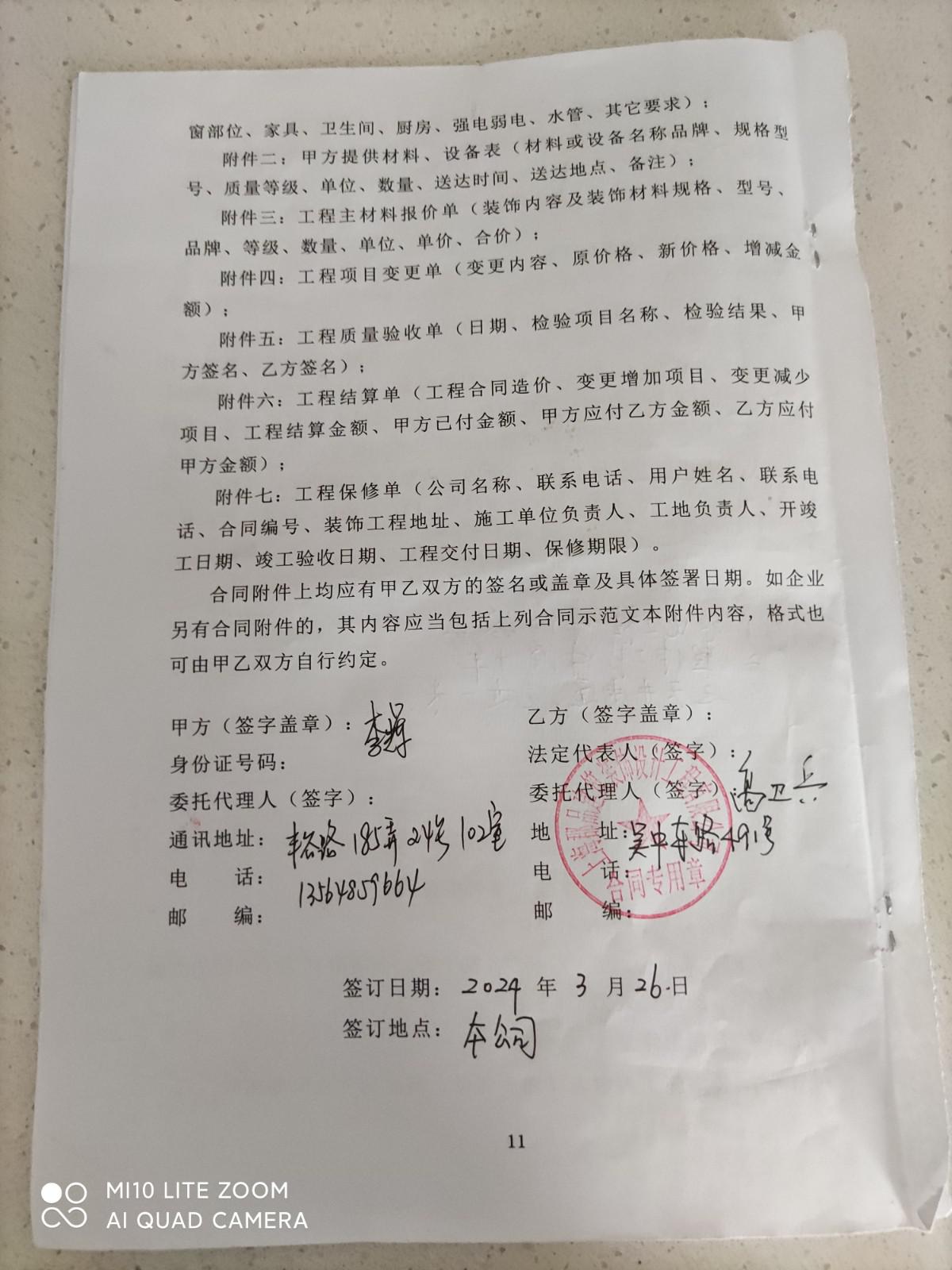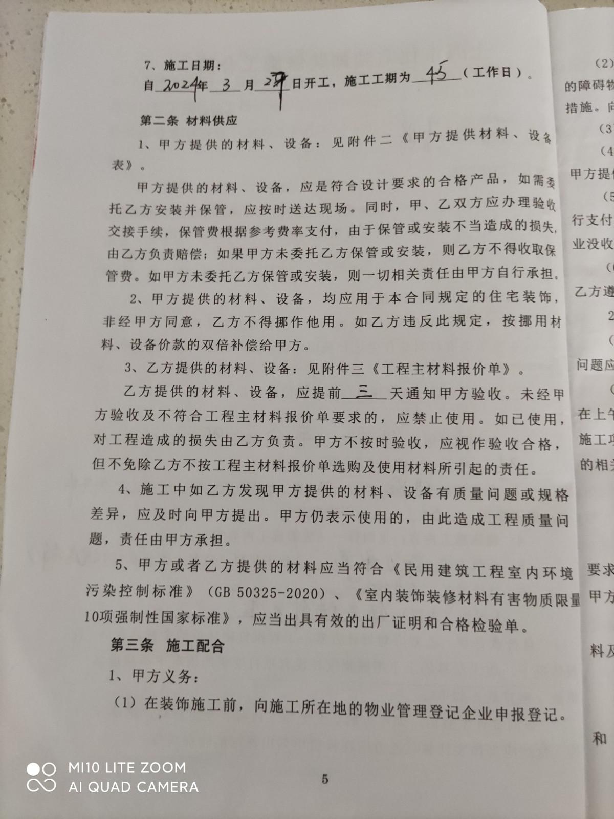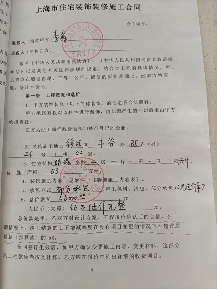 本人2024年3月26日在上??て方ㄖb飾設(shè)計(jì)工程有限公司與公司委托代理人高衛(wèi)兵簽訂裝修合同,施工地:上海市徐匯區(qū)豐谷路185弄24號(hào)102室,施工房型:二房一廳一廚一衛(wèi)一天井,施工面積53平方米??們r(jià)伍萬(wàn)陸仠元(56000元),部分承包(附造價(jià)單明細(xì)),自2024年3月27日開(kāi)工,施工期45天(工作日)。指派工程部負(fù)責(zé)履行合同,還約定違約責(zé)任,每逾期一天,賠償60元。簽訂合同當(dāng)日付款總價(jià)30%(16800元),工程款按照工程進(jìn)度支付。3月27日在施工地舉行開(kāi)工儀式,4月9日開(kāi)始拆除工作以后,材料一直沒(méi)有進(jìn)場(chǎng),到4月30日告知材料下午到。5月10日工人開(kāi)槽,排線,5月21日公司水電驗(yàn)收,