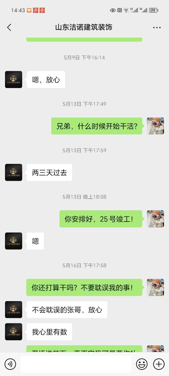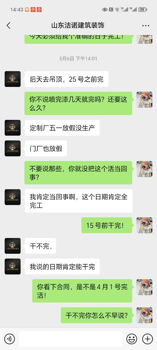 | 投訴類型 | 施工拖延 | 投訴人 | 張** | 被投訴單位 | 山東潔諾建筑裝飾工程有限公司 |
