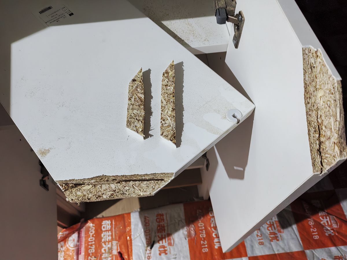 8.柜體和柜門板材,涉嫌使用同一劣質(zhì)板材,隨機選取柜體和柜門板材破開(今天請桔珈施工人員當(dāng)場破開),肉眼可見兩者截面材質(zhì)相同。