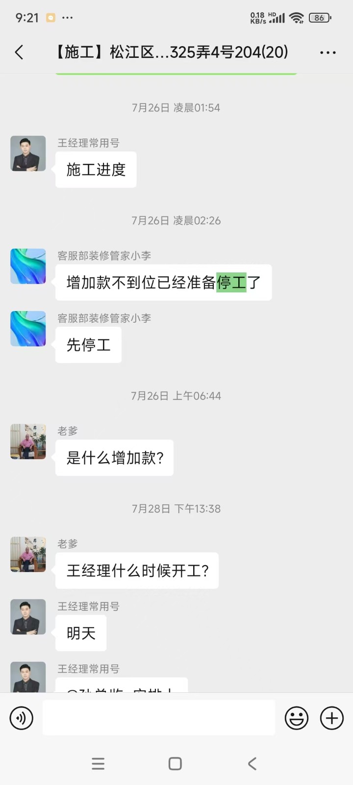 5月25日項(xiàng)目開工。開工以后項(xiàng)目進(jìn)展緩慢,原本說好的施工經(jīng)理幾乎不來現(xiàn)場(chǎng)也不關(guān)心進(jìn)度。原本承諾的自有團(tuán)隊(duì)變成了一個(gè)個(gè)小施工頭。