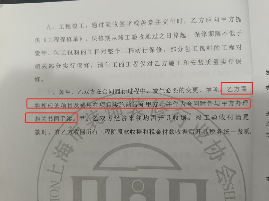 現(xiàn)在項(xiàng)目已經(jīng)到收尾階段,墻面地板都搞好了。他們又臨時(shí)增加了17個(gè)條目合計(jì)一萬余元的各項(xiàng)費(fèi)用。這些費(fèi)用的條目有的已經(jīng)在合同中涵蓋,有的是尚未發(fā)生、有的則完全不存在,而且按照合同,乙方增加項(xiàng)目需要得到甲方的認(rèn)可并辦理書面手續(xù)。這17條中有16條未得到我方認(rèn)可,屬于乙方擅自增加。