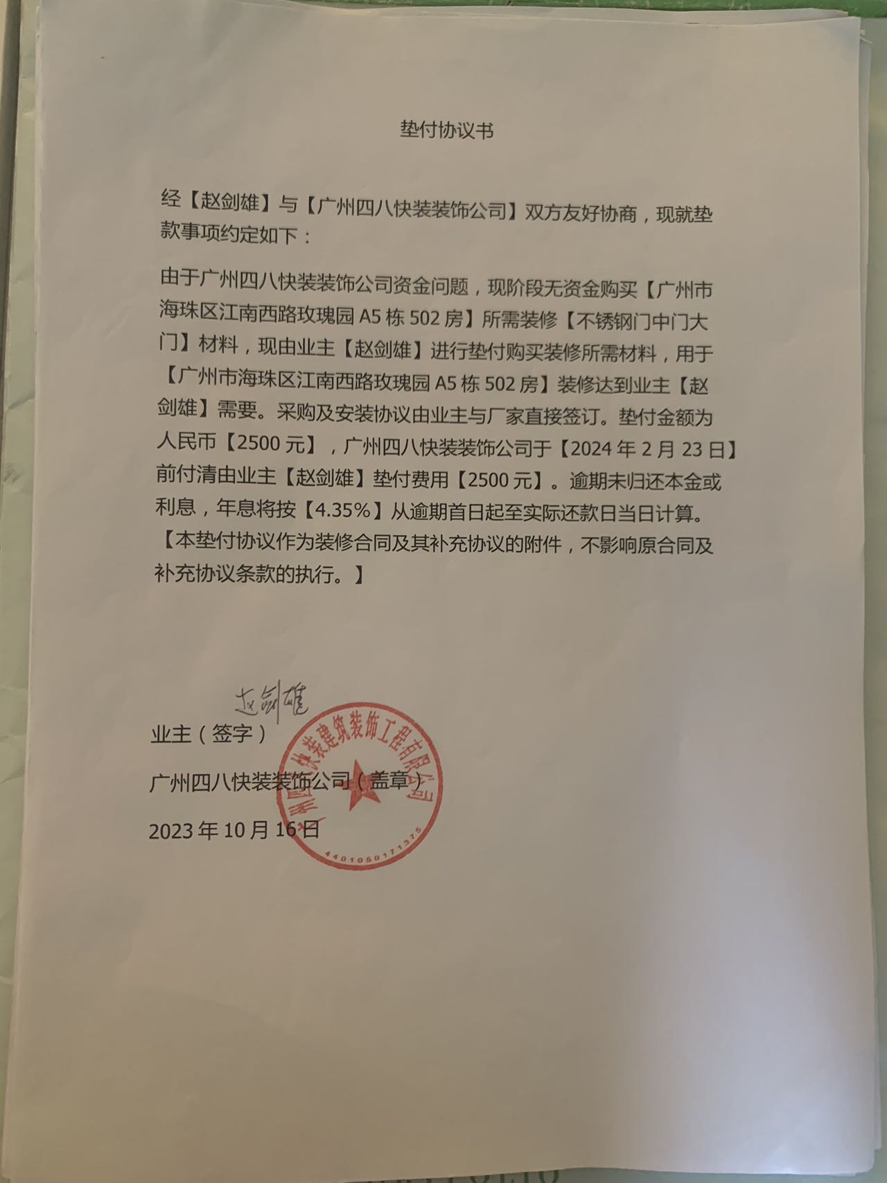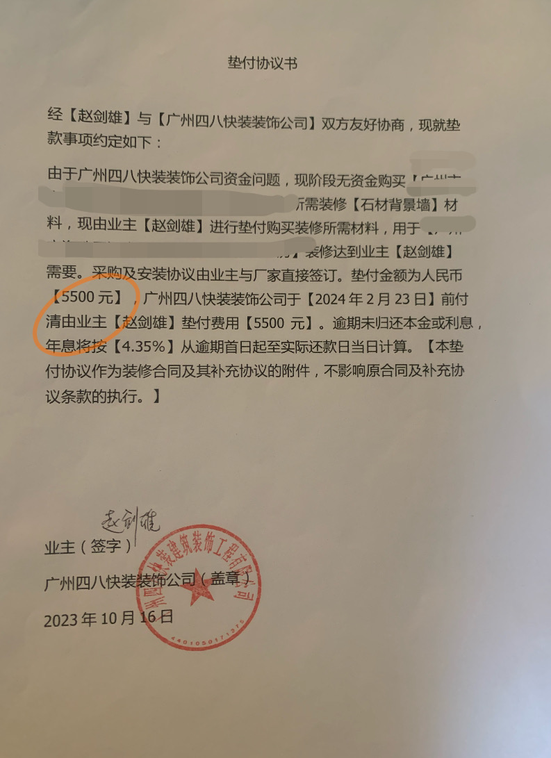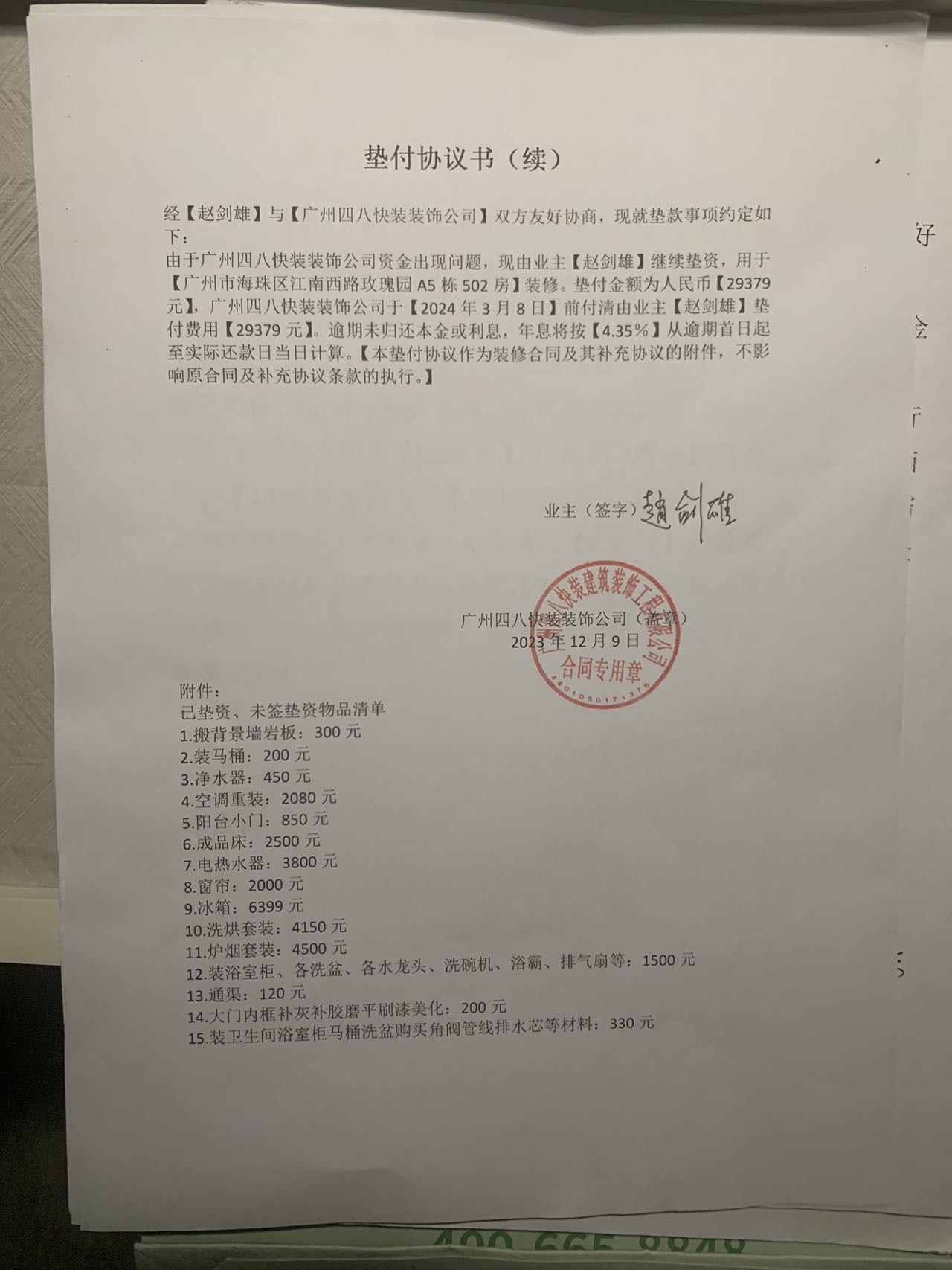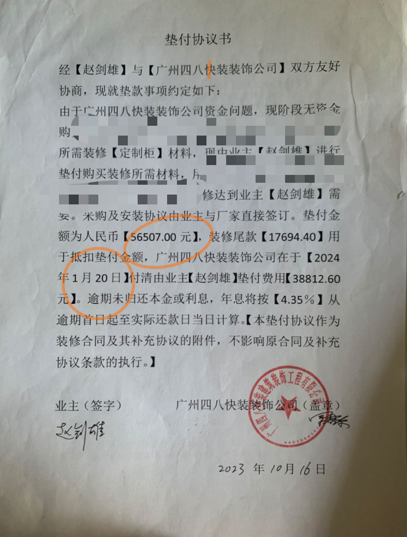 2. 讓客戶墊資卻逾期不還。期間讓我們墊款、產(chǎn)生延誤費、未兌現(xiàn)裝修項目折現(xiàn)共計11.93萬元。目前全部款項已逾期(最后一筆應于2024年3月8日前歸還)。未還本金【9.13】萬元,利息未計。上次投訴過后只是“踢一腳,走一步”,到了2024年7月份更是進展緩慢。