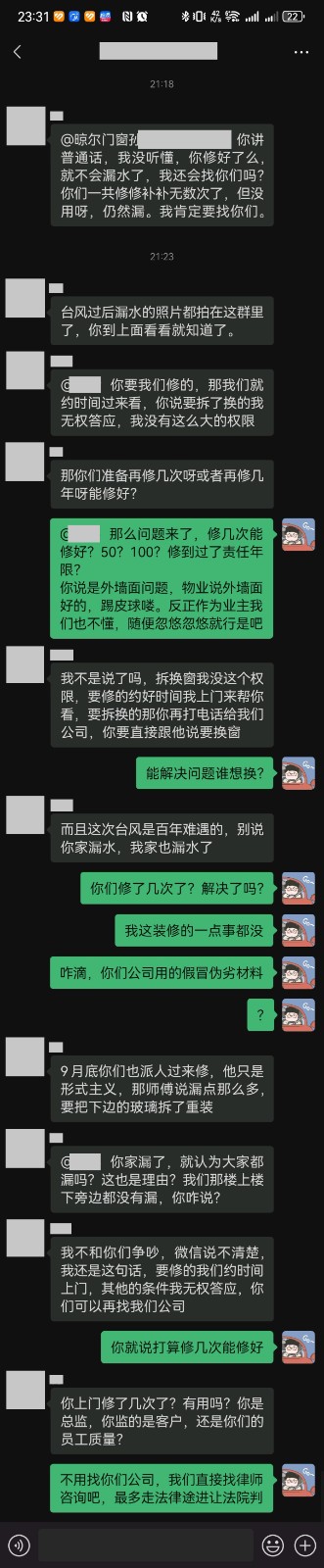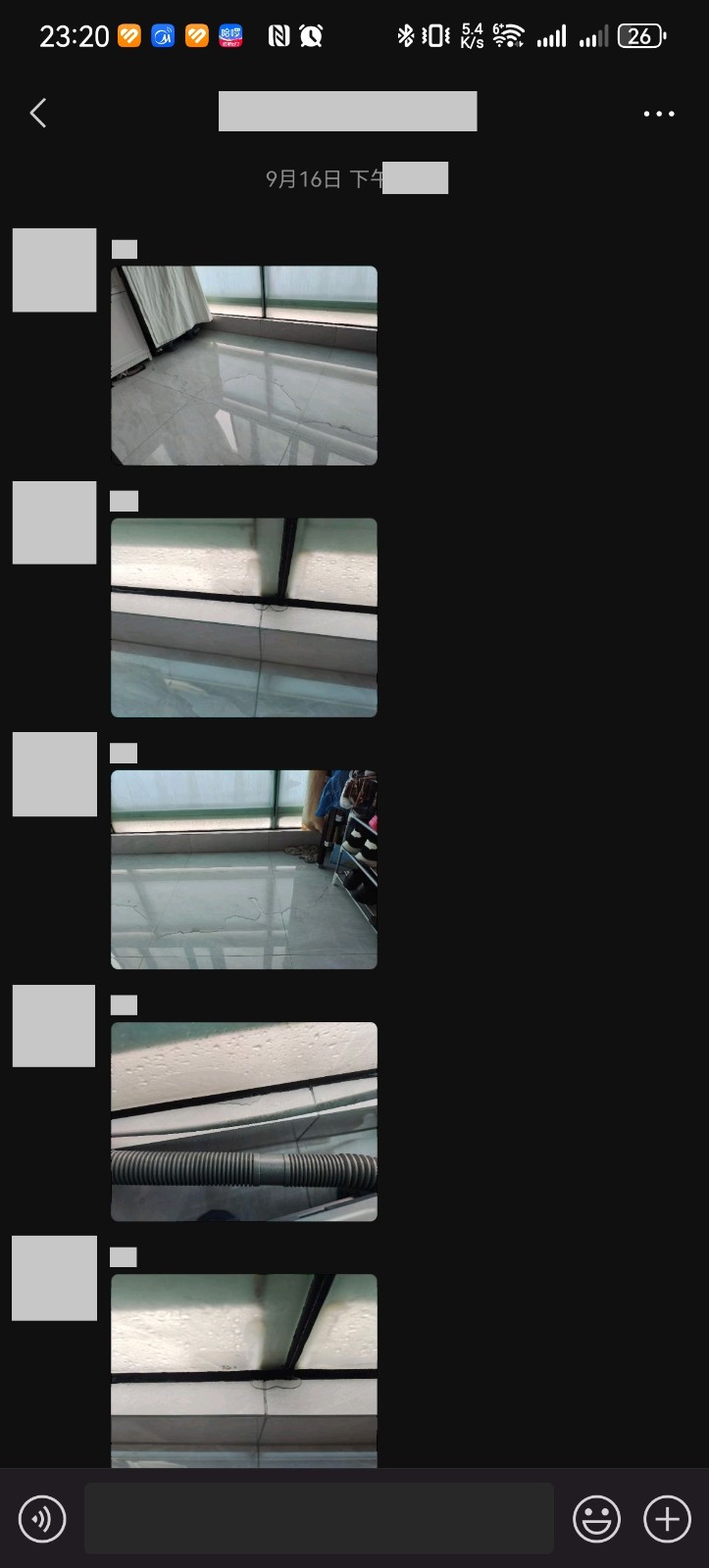 于9月16再次滲水嚴(yán)重,監(jiān)理表示外墻漏水并不是公司的責(zé)任。物業(yè)也表示外墻面不存在漏水情況是裝修公司陽臺沒封好。