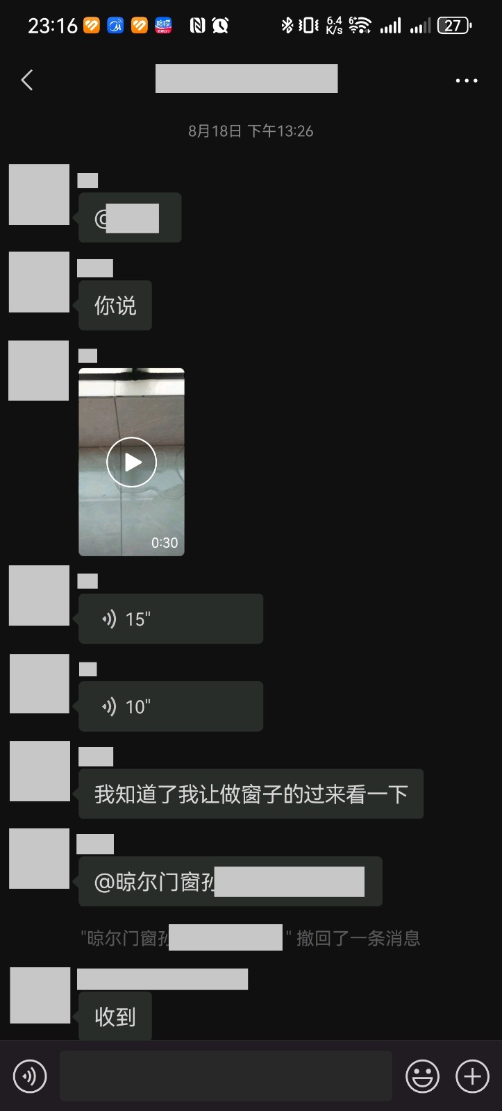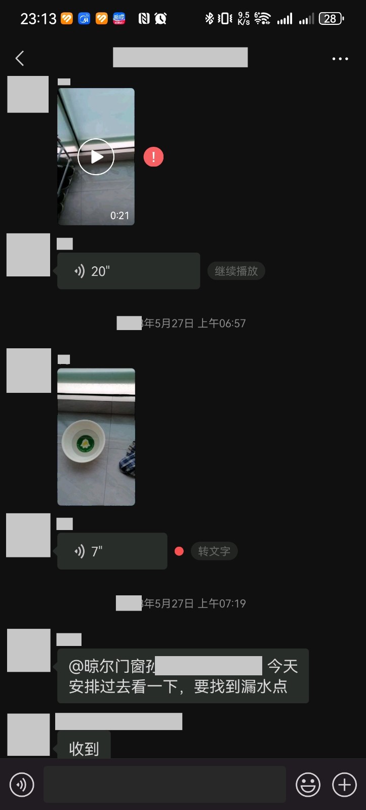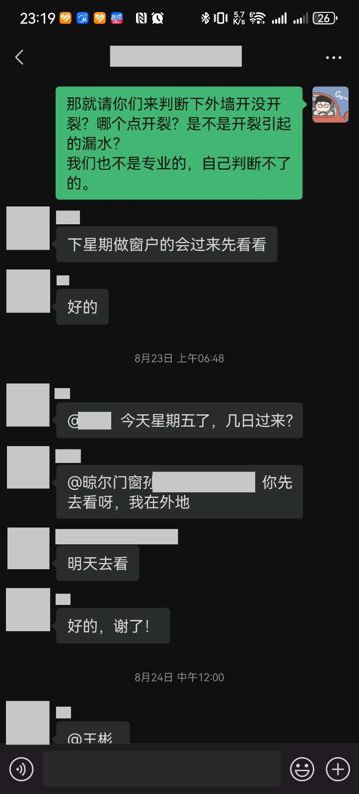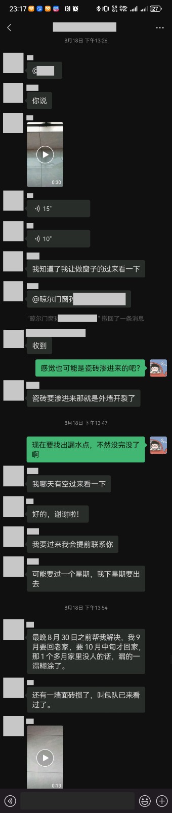 于2024年8月18再次漏水懷疑說是外墻引起的,說要求檢查外墻,外墻開裂要找物業(yè),溝通期間請裝修公司安排師傅上門確認(rèn)哪里開裂以便像物業(yè)反饋,經(jīng)反饋物業(yè)后物業(yè)安排師傅上門檢查說外墻沒有開裂。