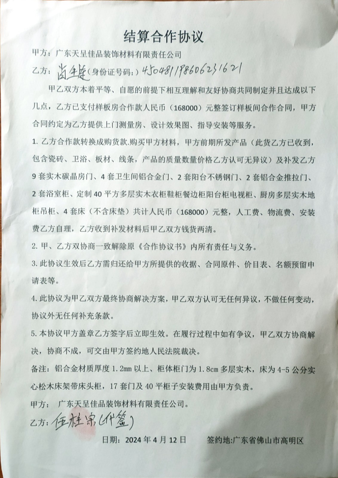 | 投訴類型 | 合同糾紛 | 投訴人 | 伍** | 被投訴單位 | 廣東天呈佳品裝飾材料有限責(zé)任公司 |