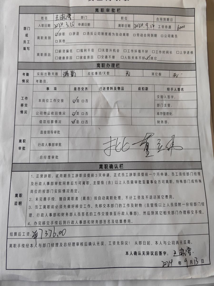 離職同意后結(jié)算工資共計(jì)1.7萬(wàn)元,(給公司買(mǎi)材料的錢(qián)未報(bào)銷,共計(jì)1670.28元。)