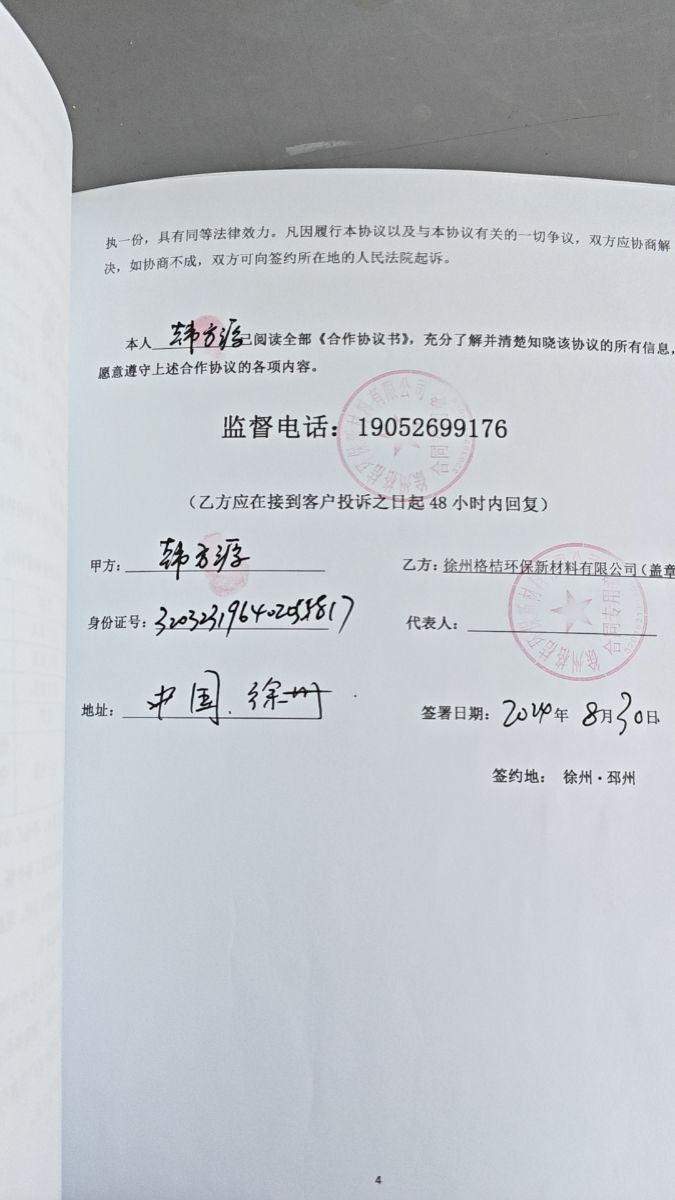 | 投訴類型 | 合同糾紛 | 投訴人 | 韓** | 被投訴單位 | 徐州格桔環(huán)保新材料有限公司 |