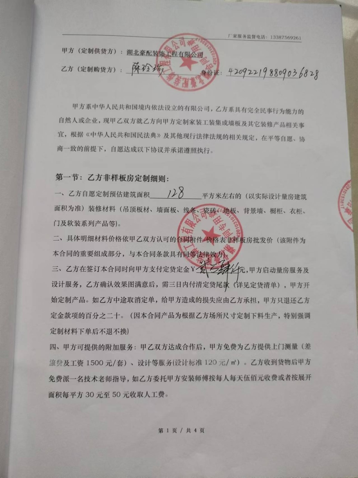 本人陳玲珍,因在網(wǎng)上看到湖北豪配裝飾工程有限公司宣傳的廣告心動了,2024.8.25號我到武漢東西湖區(qū)華中建材產(chǎn)業(yè)園革新大道898號豪配裝飾工程有限公司工廠基地去看了,之前和我聯(lián)系的微信客服接待了我,然后把我?guī)У揭粋€姓項的經(jīng)理(女)的辦公室,說是項目經(jīng)理,由她負責接待我!然后那個項經(jīng)理就帶我參觀了他們二樓的樣板房,樣板房看完以后,就帶我到她的辦公室談細節(jié),說她們公司在做宣傳,做樣板房,我的房子達到了她們做樣板房的資格!當時談的是8萬塊錢全包的?。ㄓ惭b,送3萬塊錢的軟裝)說她們最多兩個月就可以裝好!而且還送運費補貼1.5萬元,可以做到拎包入??!我想著圖省事,被她以補貼樣板房整裝誘導下簽訂了購買材料合同,當時還讓交了合同定金!我以為我裝修,這個就是裝修合同,實際這個合同就是詐騙合同,欺瞞老百姓!故意設下圈套,實際都是套路!當初談好的說是按效果圖一比一還原的,現(xiàn)在做到一半半途而廢!貨都沒發(fā)過來,就不斷的要我交后面的錢,說按流程要補齊后面的尾款,才能發(fā)貨!說是樣板房本來就是他們補貼的,先做完后收益!后面就給了一個管人工的電話給我,說姓劉,叫劉經(jīng)理!叫我人工物流啥的都找他!等到第一批貨進場,物流費,上樓費找那個劉經(jīng)理,他就讓我自己墊付,說是把單子留著!這個錢后面補貼給我!貨進場了,后面就遲遲不派人安裝我天天打電話催他,他總說沒人,叫我自己找人安裝,就這樣等了快一個月了,才派人過來給我安裝墻板,吊頂,等到派人過來,工人說發(fā)過來的,都是主料,還有輔料要購買,后面我打電話給那個和我談合同的項經(jīng)理,她說叫我自己先墊付,把單子留著,發(fā)給劉經(jīng)理!輔料都用了四千多塊錢!由于主材料發(fā)的不夠,后面我就找那個劉經(jīng)理補發(fā)幾塊過來,補料都補了半個多月,才發(fā)過來!由于等補料,中間導致停工了半個多月!后面好不容易把墻面安裝好了,頂?shù)鹾昧?!打電話發(fā)瓷磚過來,當初談的瓷磚是廣東磚,馬可波羅的,結(jié)果發(fā)過來的是瑪莎拉蒂的,還有雜牌的小磚,找那個劉經(jīng)理,他就說這個就是廣東磚,后面我天天打電話叫他派師傅安裝!他以沒有師傅為由!叫我自己當?shù)卣規(guī)煾?,完工之后工錢由他們出!我還有錄音為證!后面磚貼完再找劉經(jīng)理,他就換了說法了!說我給的錢用完了,貼瓷磚的要我自己出!要我加錢才能發(fā)房間的木地板,柜子,門,這不是明擺著欺騙消費者嗎?我只想問你們這個8萬是怎么算出來的?什么叫做全屋定制?當初我們就是奔著“”全屋”定制的效果來的,不然光買材料找你們干什么?哪里買不到材料?再說了,我這個材料就是竹炭大板,后面找專業(yè)的人看了,說這個市面上值不了多少錢,當初我談細節(jié)的時候,那個項經(jīng)理還說七八百一平方,簡直就是忽悠!之前談的時候,項經(jīng)理說了除了水電,防水你們公司不做以外,其余的墻、頂、地以及軟裝都是她們公司的,再說了我們大老遠跑到貴公司一趟不就是為了看他們的全屋定制是用的哪些材料的嗎?現(xiàn)在來與我說我們說簽的是包材料的合同,這不是欺騙消費者嗎?退一萬步講,當初談好的8萬塊錢全包!他們公司經(jīng)過預算超出了他們承受范圍完全可以