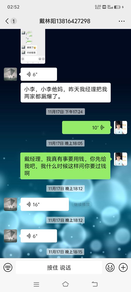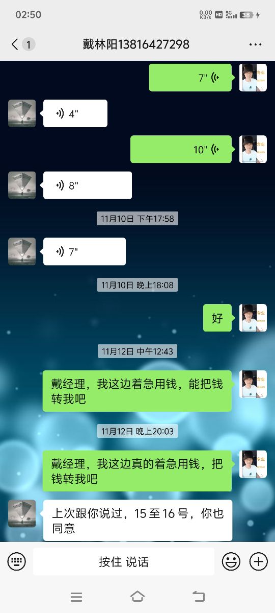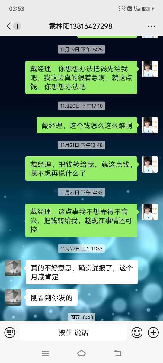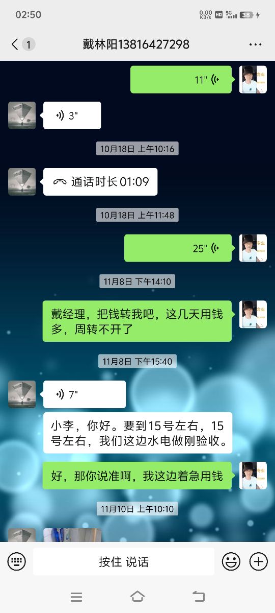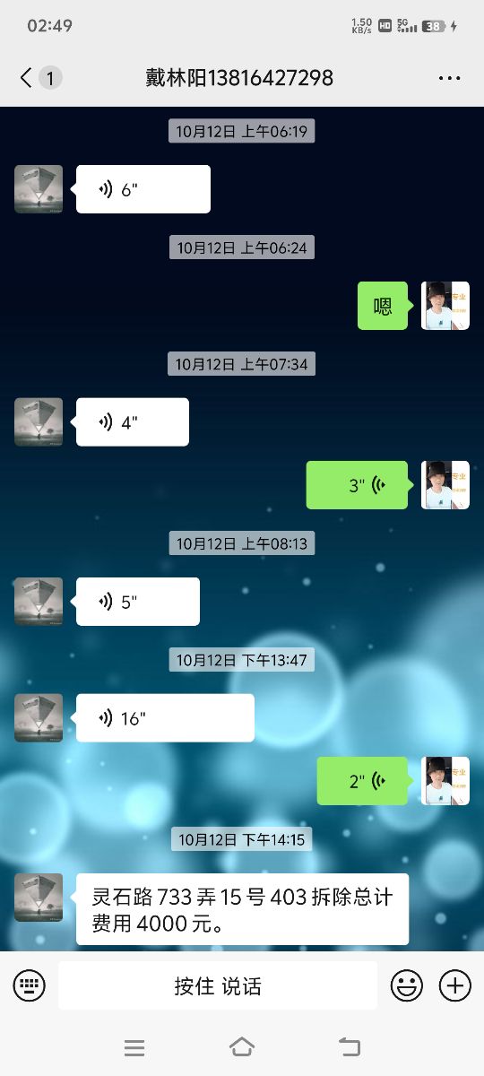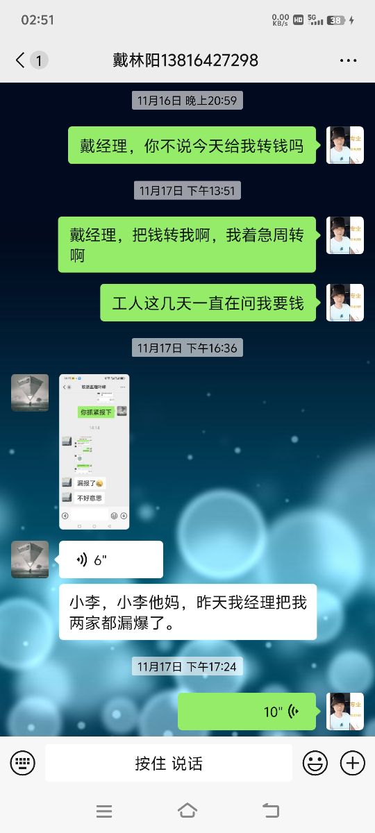 今年十月八號(hào),歐派裝修公司項(xiàng)目經(jīng)理戴林陽(yáng),找我做了,上海靜安區(qū)靈石路733弄萬(wàn)榮小區(qū)15號(hào)樓403室的裝修拆舊工作,當(dāng)時(shí)談好了四千塊錢,工作結(jié)束后,遲遲不給結(jié)賬,找各種理由推托,當(dāng)時(shí)說(shuō)好干完就給結(jié)賬的,這個(gè)錢房東也早就給他了,可他至今也沒(méi)給我結(jié)清,希望平臺(tái)能幫助我解決問(wèn)題