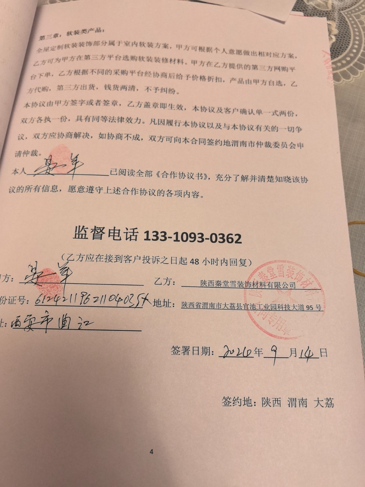 | 投訴類型 | 裝潢材料 | 投訴人 | 晏** | 被投訴單位 | 陜西秦堂雪裝飾材料有限公司 |