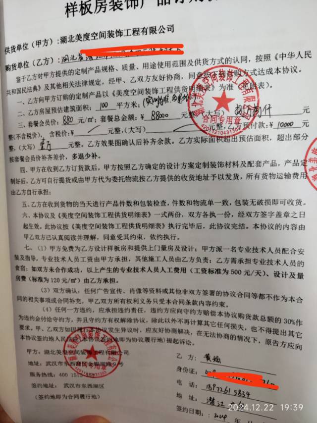 武漢東西湖區(qū)美度空間裝飾工程有限公司碳晶板全屋整裝被詐騙全過程