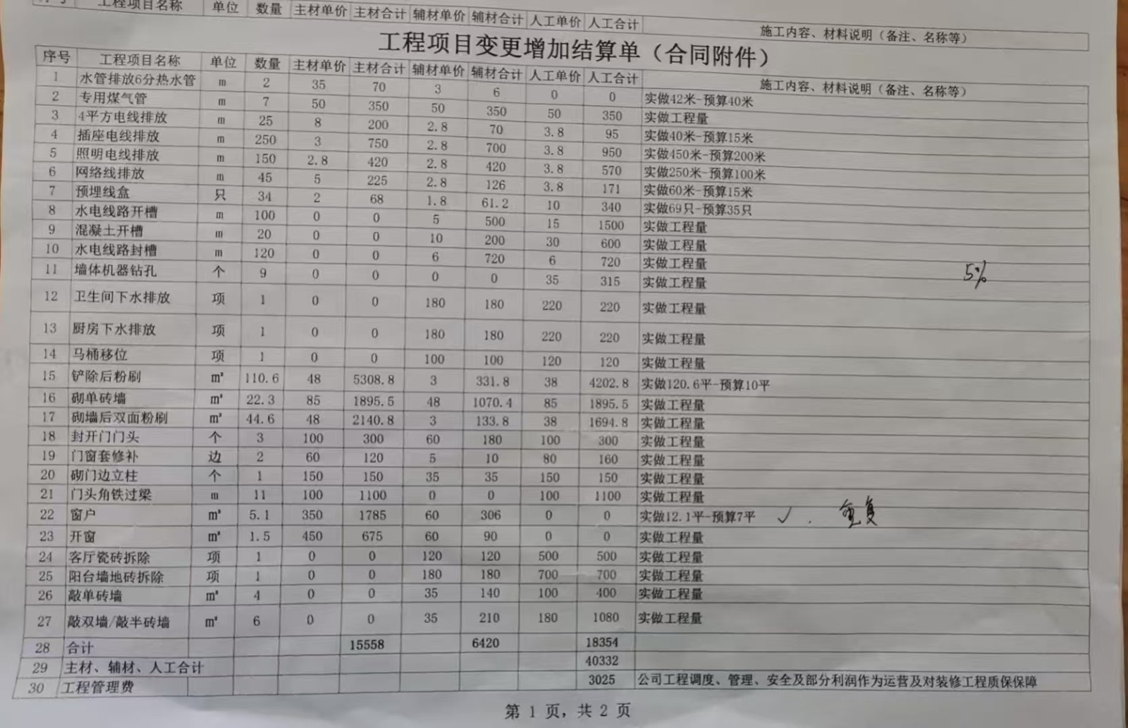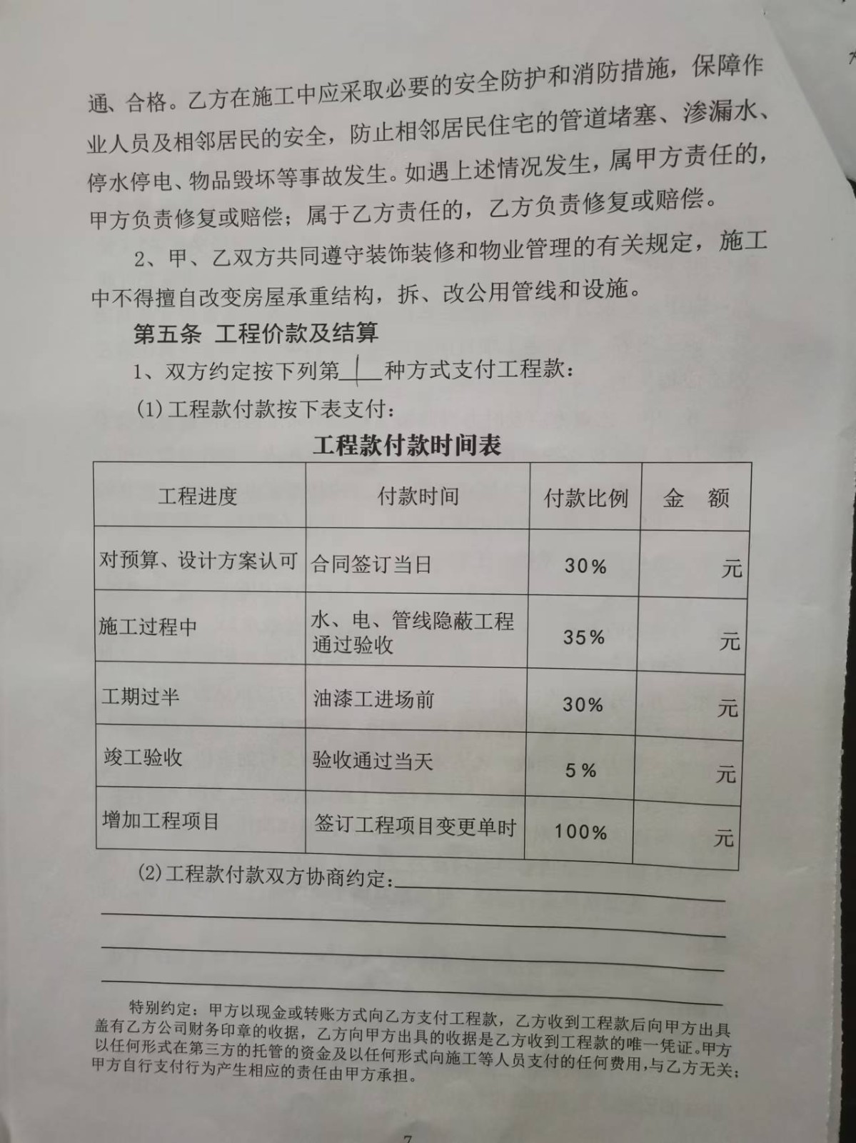 2024年12月25日,項(xiàng)目經(jīng)理和設(shè)計(jì)師張杭通知我們說:水電工已完成,請付第二批工程款,我們馬上給你進(jìn)行下一步工序。我們于當(dāng)天和次日一早把第二筆工程款付于對方,現(xiàn)已付總計(jì)金額43500元。我們付款后,他們遲遲不愿意做后續(xù)的裝修安排。并于2024年12月31日項(xiàng)目經(jīng)理約我到施工現(xiàn)場,在施工現(xiàn)場他給了我一份項(xiàng)目工程變更增加結(jié)算單,總金額43357,讓我簽字確認(rèn)。因從開工到現(xiàn)在,他們一直按設(shè)計(jì)圖紙?jiān)谑┕?,從沒提前告知我哪些是增項(xiàng)需要我選擇和確定,我也沒有做任何變更和增加。在我不知情的情況下,突然增加了43357萬多元。我當(dāng)場給予否決,不予確認(rèn)。他就以我不確認(rèn)為理由,拒絕后續(xù)的施工。