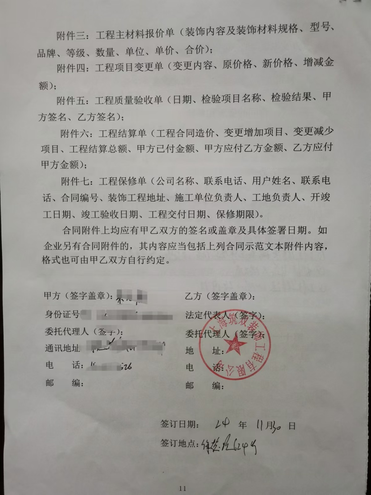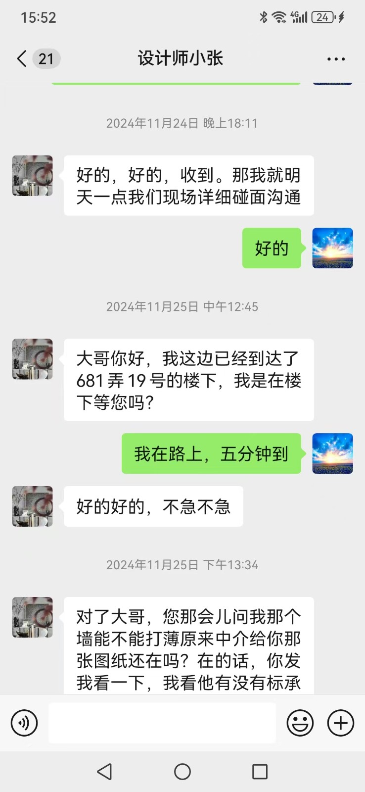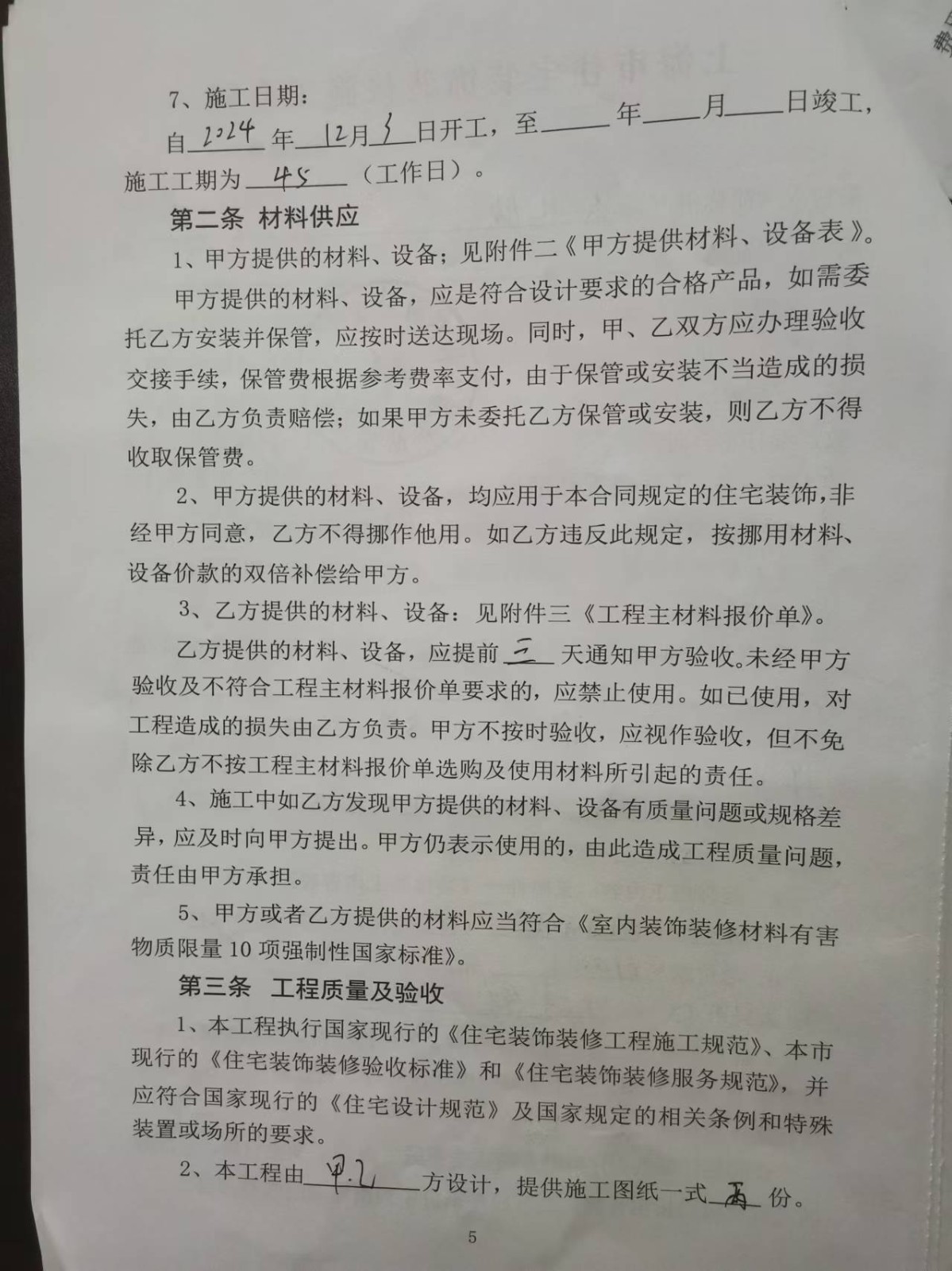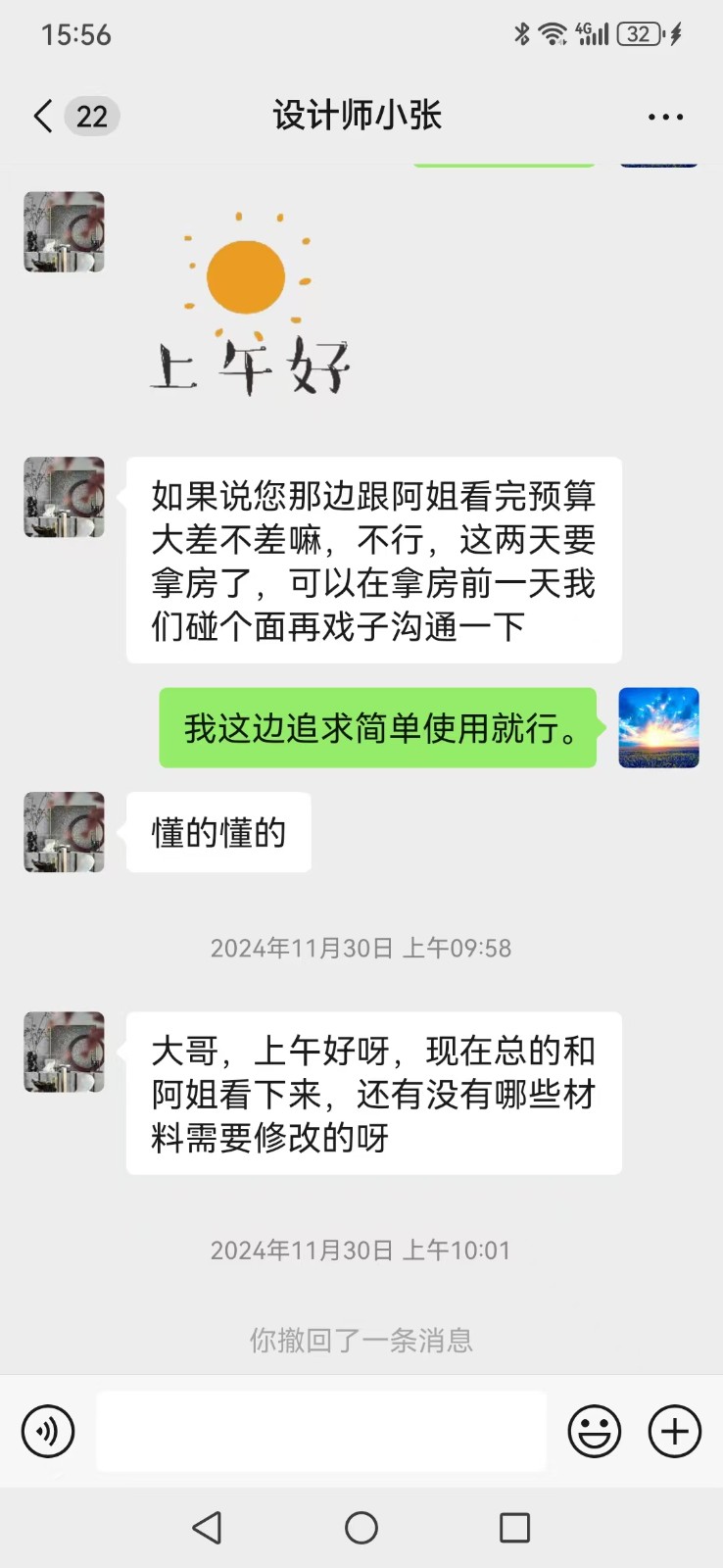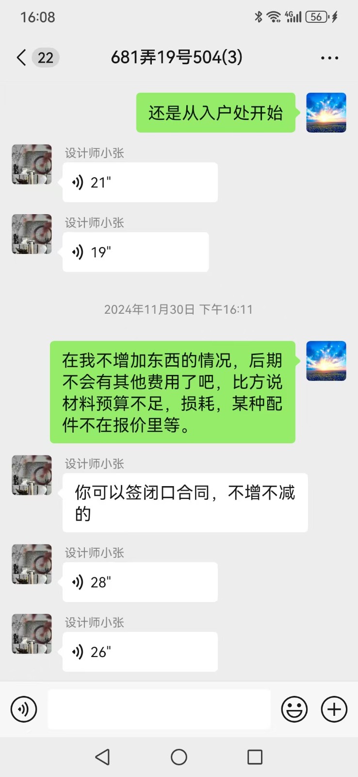 設(shè)計(jì)師張杭于2024年11月25日去我需要裝修的房子內(nèi),進(jìn)行了現(xiàn)場察看和測量,并現(xiàn)場再次溝通確定了在總裝修預(yù)算6萬以內(nèi)可以完成我的裝修需求,然后他給予了設(shè)計(jì)方案和報(bào)價(jià)單。前期的報(bào)價(jià)單里他說地板和板材不是很環(huán)保,因?yàn)榧依镉袃蓚€兒童,我們就升級了主材,最后報(bào)價(jià)單確定總價(jià)在61000元。 因剛貸款買房加上兩個寶寶需要撫養(yǎng),生活壓力比較大,我們對裝修的總預(yù)算一直都是比較謹(jǐn)慎的,多次和他確認(rèn)裝修過程中會不會材料不足,漏報(bào),損耗等產(chǎn)生其他費(fèi)用,他都明確回復(fù):后期的話不會產(chǎn)生任何費(fèi)用,你們只需要買點(diǎn)家具家電就能直接入住?;谒捌谟袉柋卮?、待人熱情,我們對他產(chǎn)生了百分之百的信任,并于2024年11月30日晚到他店里簽了裝修合同(他說這個合同是全市統(tǒng)一的,不用看,相信我就對了,這個價(jià)格一定給你們裝修的好好的,年前能完工90%,定制的柜門和移門可能需要年后完工,作為裝修小白的我們,基于看也看不懂的心理,就直接簽了字。)