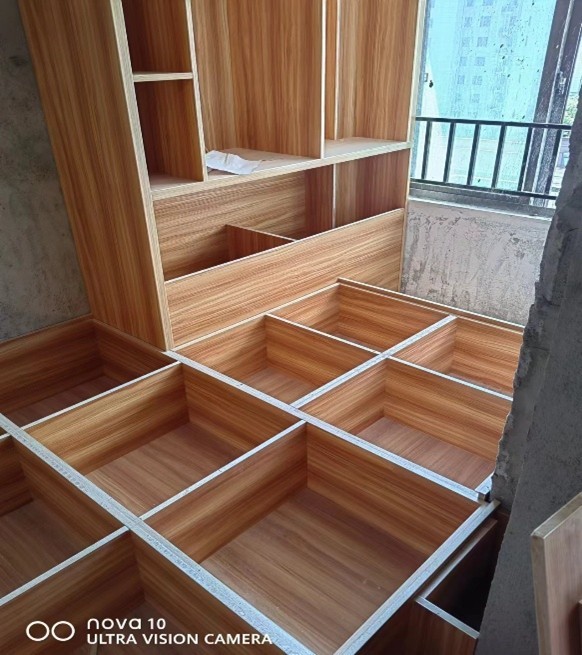 然后木工進(jìn)場,也沒有任何交底圖紙我也是后來才拿到的,那段時(shí)間也比較忙心想群里沒報(bào)進(jìn)度,因該木工還沒進(jìn)場,因?yàn)楹芏喙褡拥募?xì)節(jié)都沒明確,包括我的廚房家電想法都沒探討好。于是決定回來到他們公司溝通清楚,然而還沒回來群里已經(jīng)把成品照片發(fā)了一部分出來了(柜子的顏色竟然也和我之前選的不一致)。