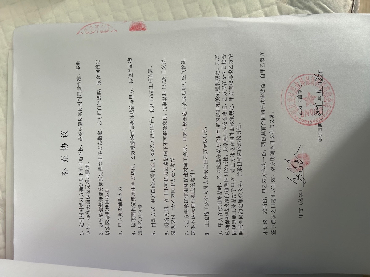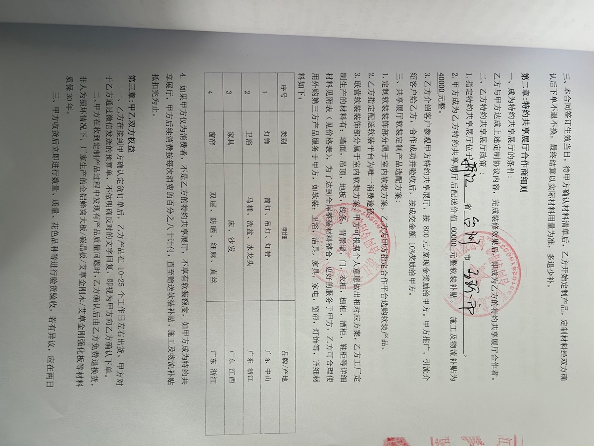 我們過去看了,里面和普通的裝修市場(chǎng)沒什么區(qū)別,內(nèi)含有一個(gè)板材工廠。對(duì)接的銷售說的很好,大致意思是:10幾萬能搞定所有的硬裝,軟裝費(fèi)用是按照指定平臺(tái)(天貓、京東、)的價(jià)格來給我們?nèi)~報(bào)銷(報(bào)銷金額六萬元)我們當(dāng)時(shí)還問了一下板材的運(yùn)費(fèi)這一塊,對(duì)方承諾是運(yùn)費(fèi)由我們墊著先,問司機(jī)要發(fā)票后公司給我們報(bào)銷,我們問過后期還有沒有額外的費(fèi)用,對(duì)方說是沒有的,當(dāng)時(shí)沒有錄音…..簽合同時(shí)是按照平方來算的(包含硬裝、軟裝)對(duì)方一開始出了設(shè)計(jì)圖,也按規(guī)定時(shí)間內(nèi)把板運(yùn)到家里,這個(gè)時(shí)候騙局開始了,他們承諾搬上樓,但是又臨時(shí)開價(jià),沒辦法我們自己搬上樓。接著輔材用件又臨時(shí)有我們自己購買,運(yùn)費(fèi)由原先的后期補(bǔ)給我們變成了額外的報(bào)銷,且只報(bào)銷20%。