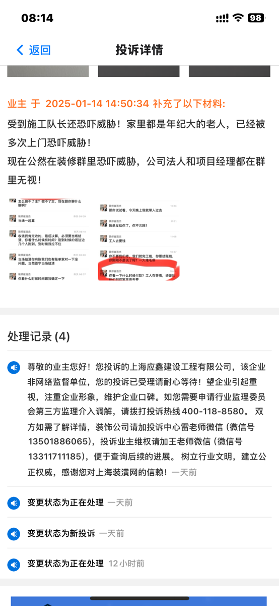 | 投訴類型 | 施工質量 | 投訴人 | 劉** | 被投訴單位 | 上海應鑫建設工程有限公司 |