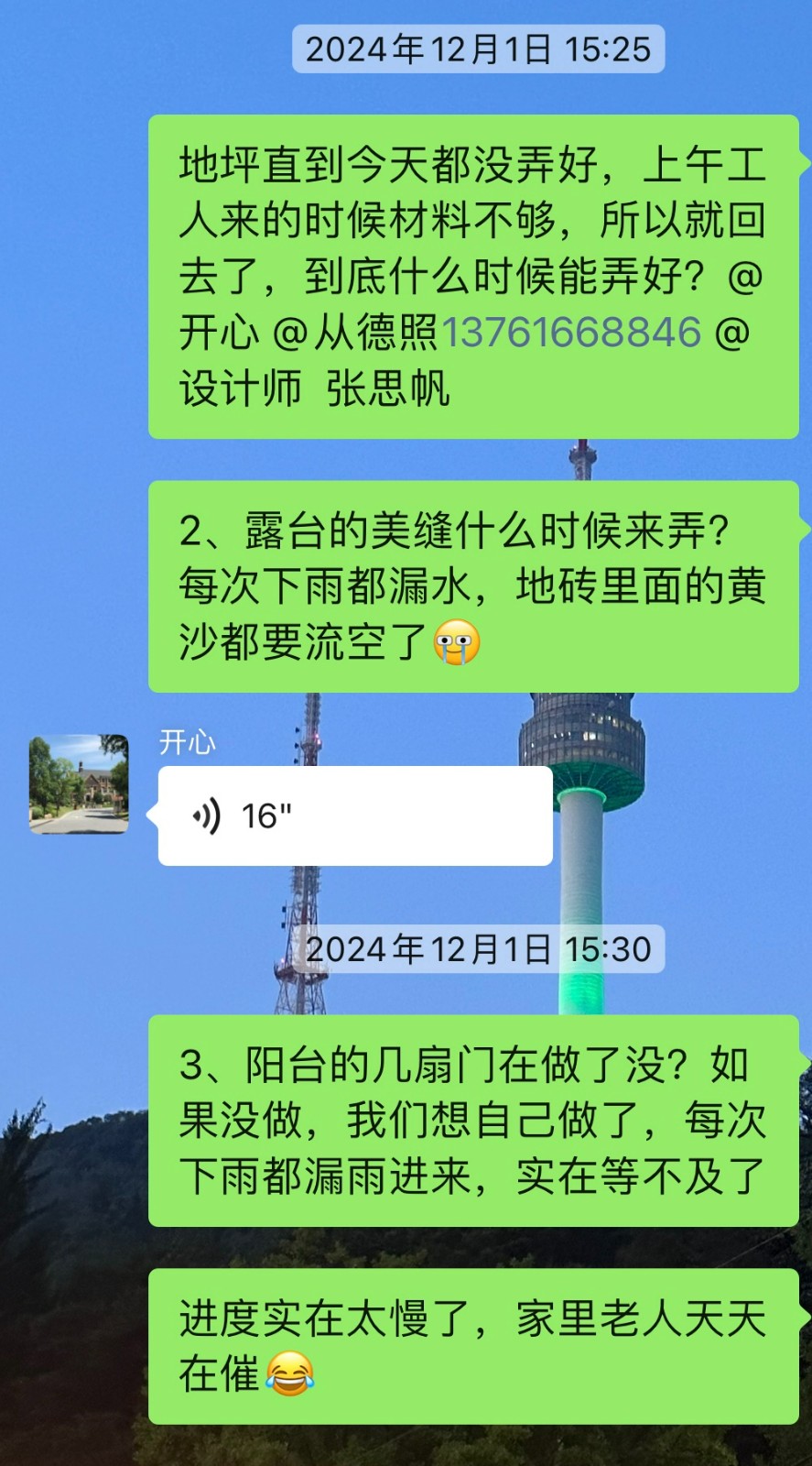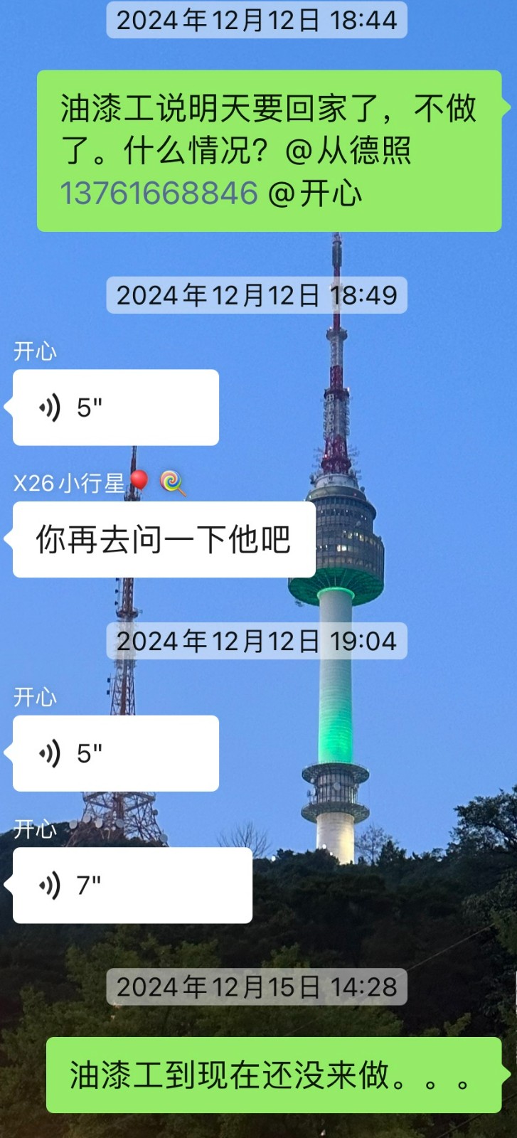 | 投訴類型 | 施工拖延 | 投訴人 | 錢** | 被投訴單位 | 上海林育建筑裝飾工程有限公司 |