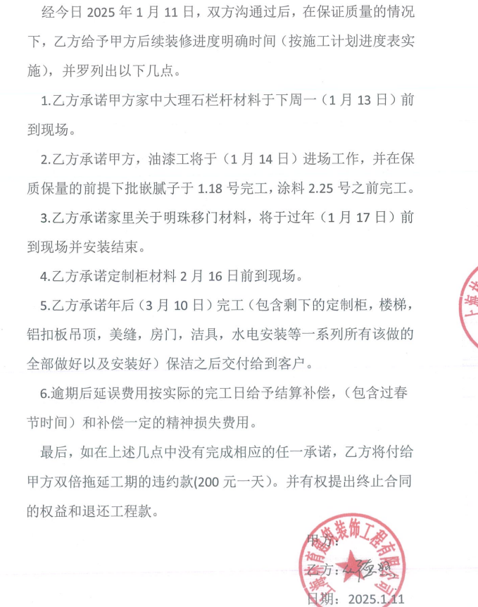 補充協議:答應我們完成的工程及時間節(jié)點,未履行承諾