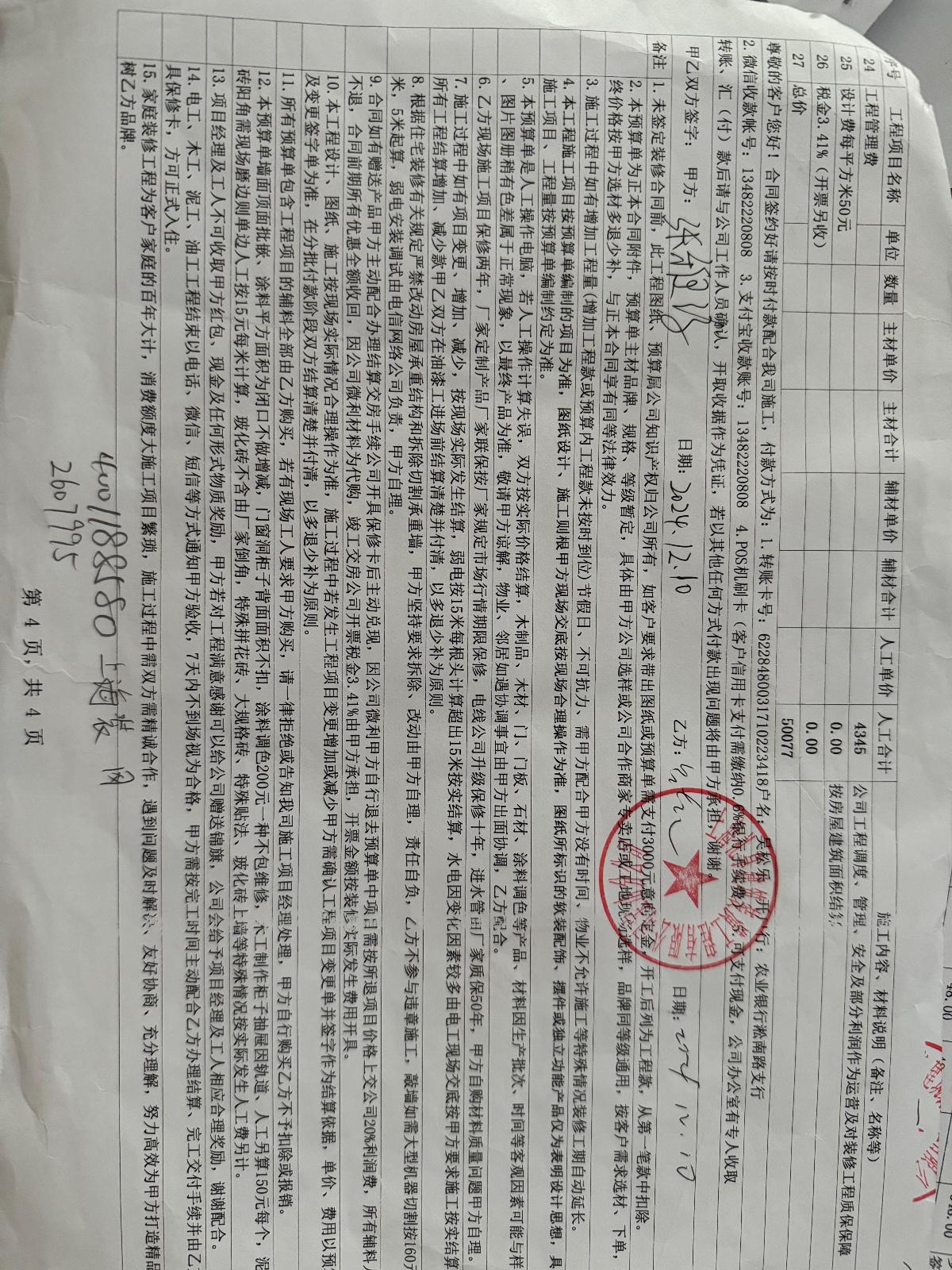 2024 年,由于我對裝修知識了解有限,在該公司設計師量房并做出效果圖后,依據合同預算,我與該公司簽訂了金額為 5 萬元的裝修合同。當時店內工作人員承諾,5 萬元能在無任何增項的情況下完成高質量裝修,且所用材料均為安全品牌產品。然而,合同存在大量惡意漏項,甚至出現虛報尺寸的行為,這嚴重違背了當初的承諾。