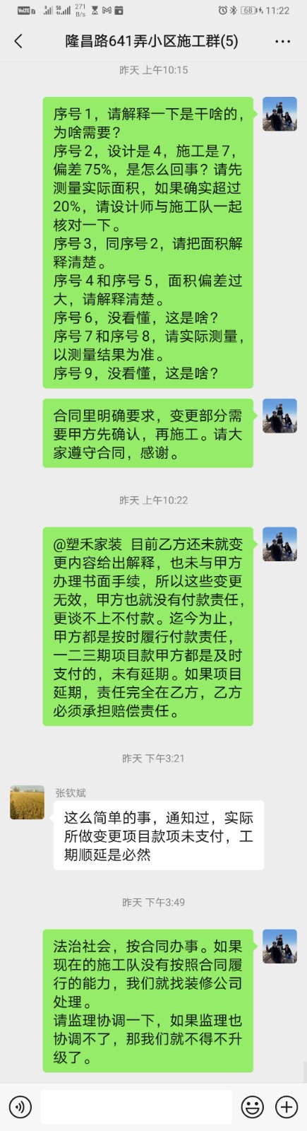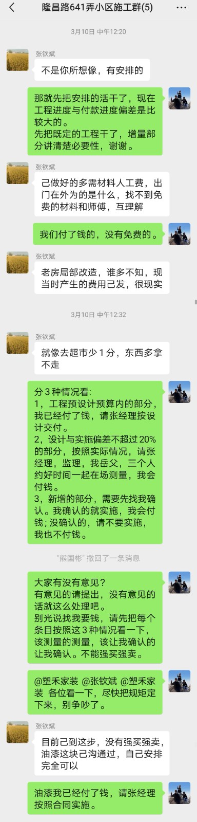 你好,我是上海市楊浦區(qū)隆昌路641弄5號604室業(yè)主(甲方),與上海塑禾家裝飾工程有限公司(乙方)簽訂了裝修合同,乙方指定張欽斌 13788904523 作為項目經(jīng)理,與2025年2月22日正式開工,約定30天完工。