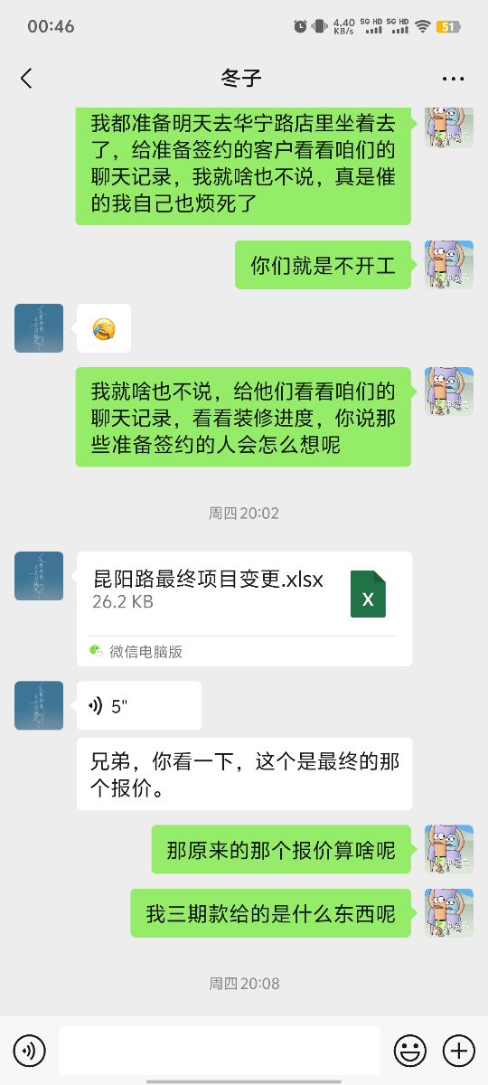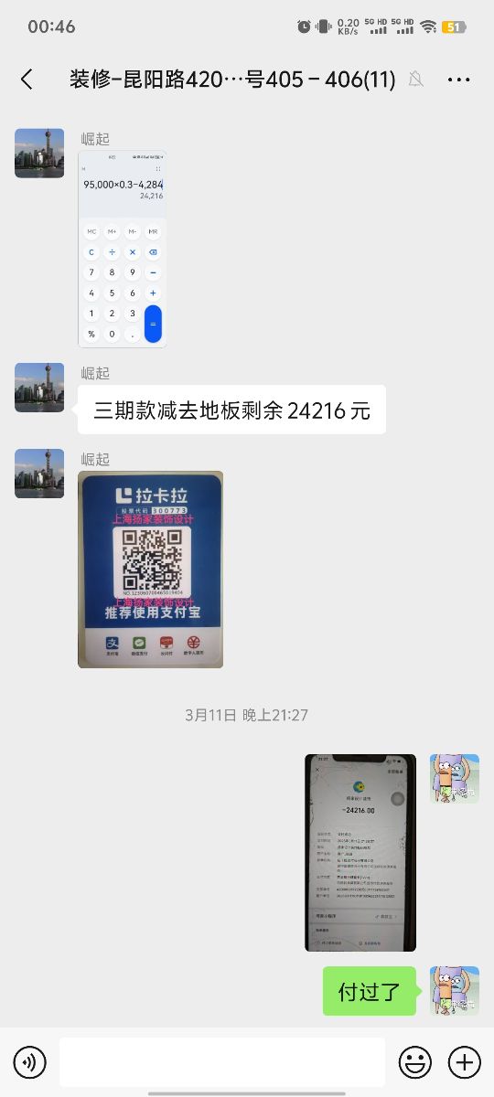 6.地磚鋪設(shè)完成后,付三期款,付完三期款,要求加19120的增項(xiàng),這誰(shuí)頂?shù)米。皫浊K錢就算了,這次直接兩萬(wàn)了,我之前付的一期二期三期款九萬(wàn)塊錢去哪里了。目前只剩下尾款4600還沒(méi)付。