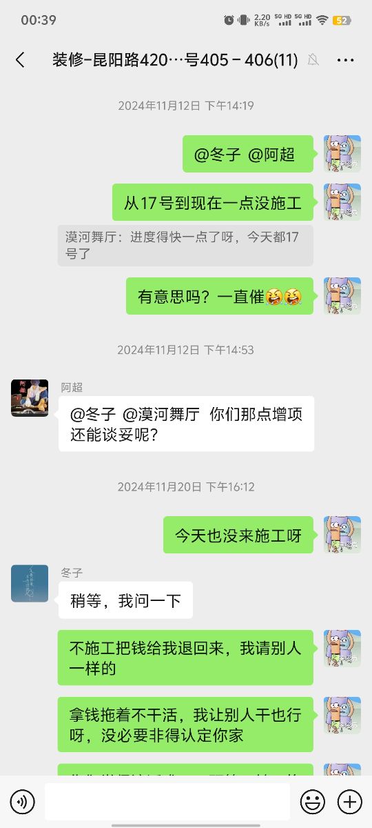 合同工期60個(gè)工作日,2024年8月31號(hào)簽的合同,至今只貼完瓷磚,近7個(gè)月,只干到貼完瓷磚,油漆工木工均未進(jìn)行,惡意拖延工期,就一味加錢要錢。