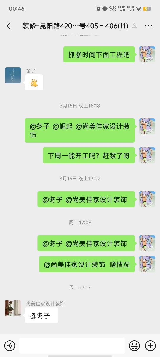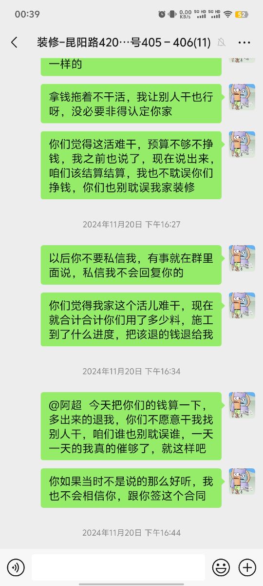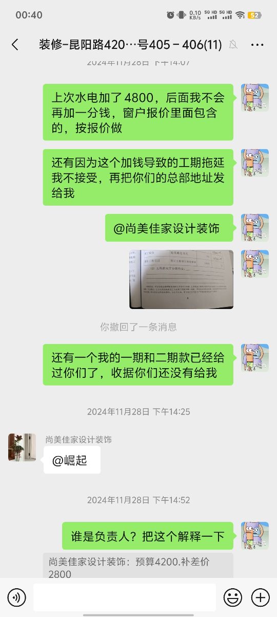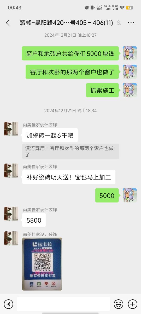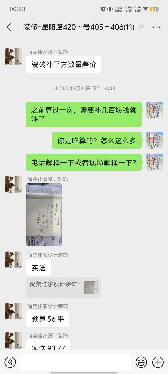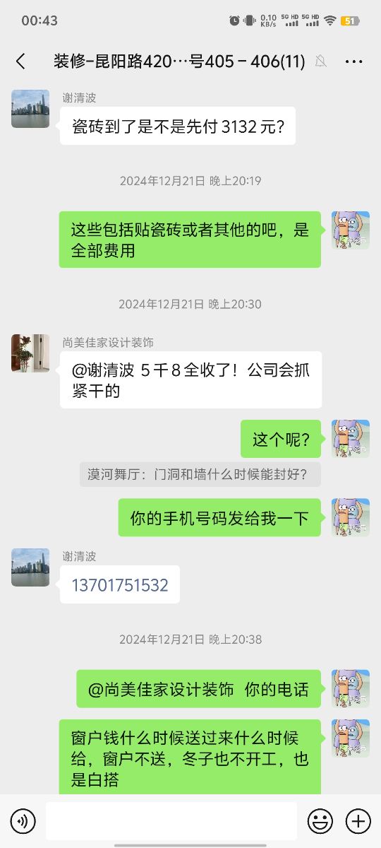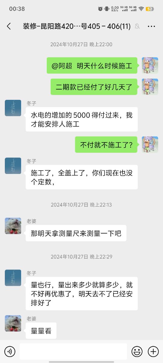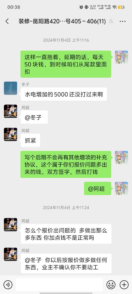 從2024年8月31號(hào)簽合同。到2025年3月21號(hào)只做了水電,地磚鋪設(shè)以及墻面。期間每做一項(xiàng)都會(huì)額外增收費(fèi)用。